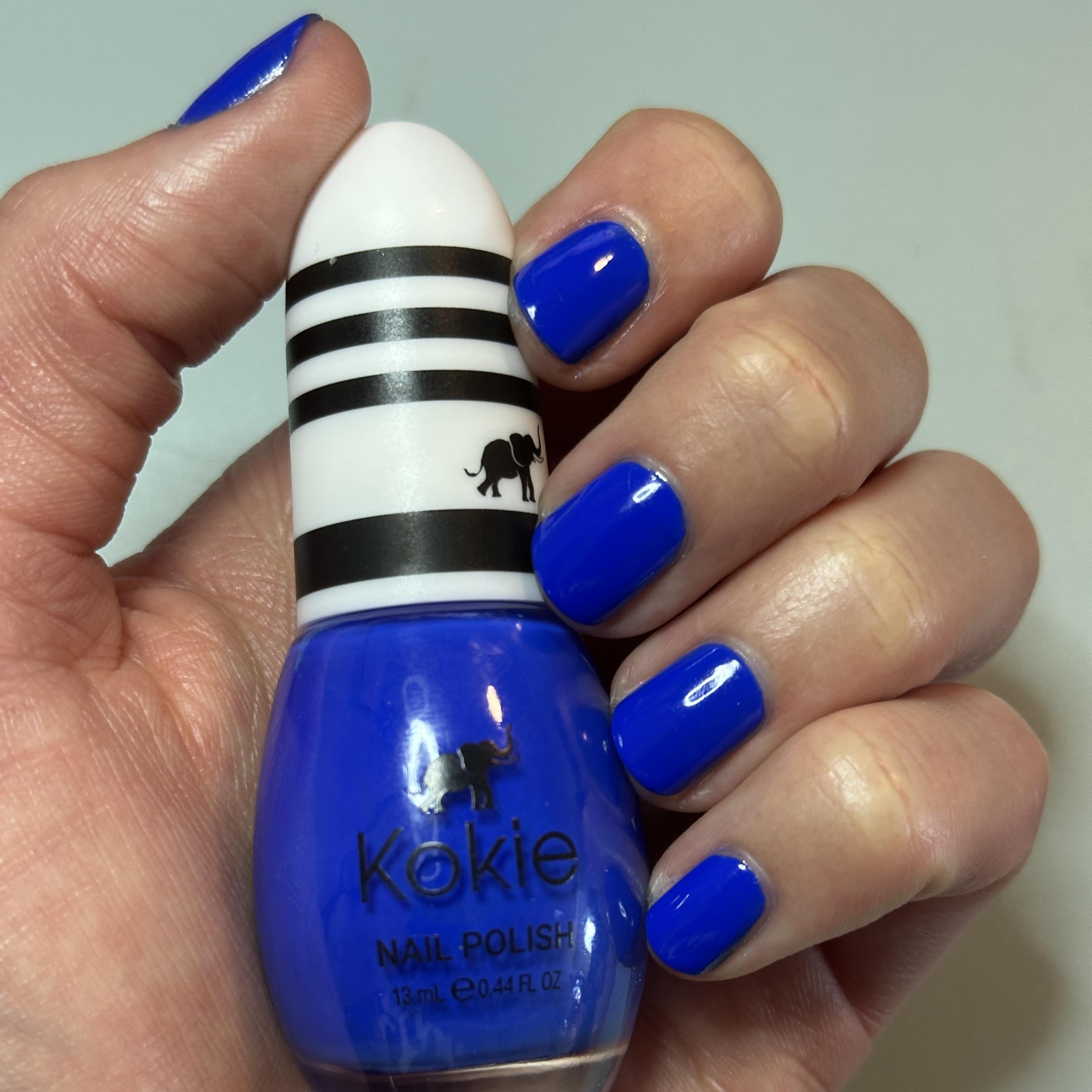 2 coats of Kokie nail polish “Royally Blue” over 1 coat Mooncat Hardcore Base Coat. Bees Knees I’m Fast top coat to give that gorgeous glossy shine.