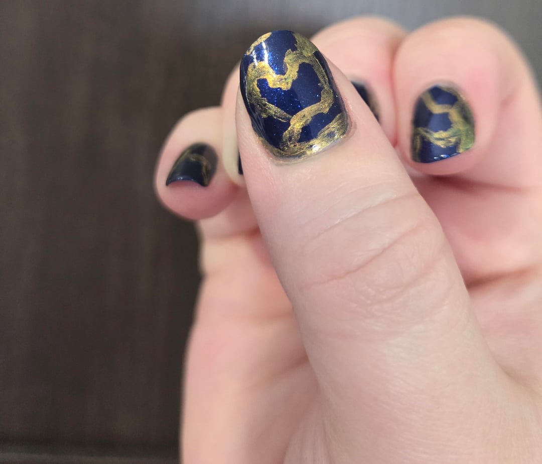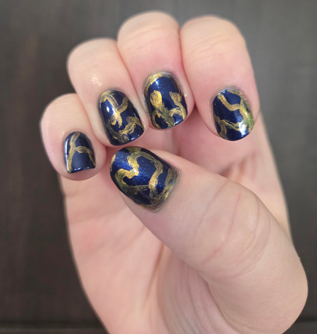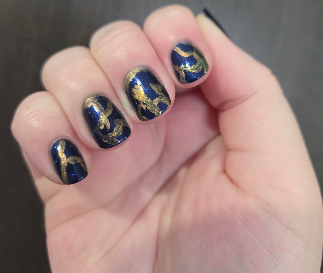 I tried making it look like kintsugi pottery because I've always thought those were so pretty. I originally wanted to make it make a particular reference photo that had brush strokes. Sort of showing off this darker blue and a slightly brighter, shimmery blue. The shades I have are way too similar though so you couldn't see the difference lol. I'll have to try again some other time. I also tried too hard to make the lines have definition other than being straight. I want to make them thinner next time