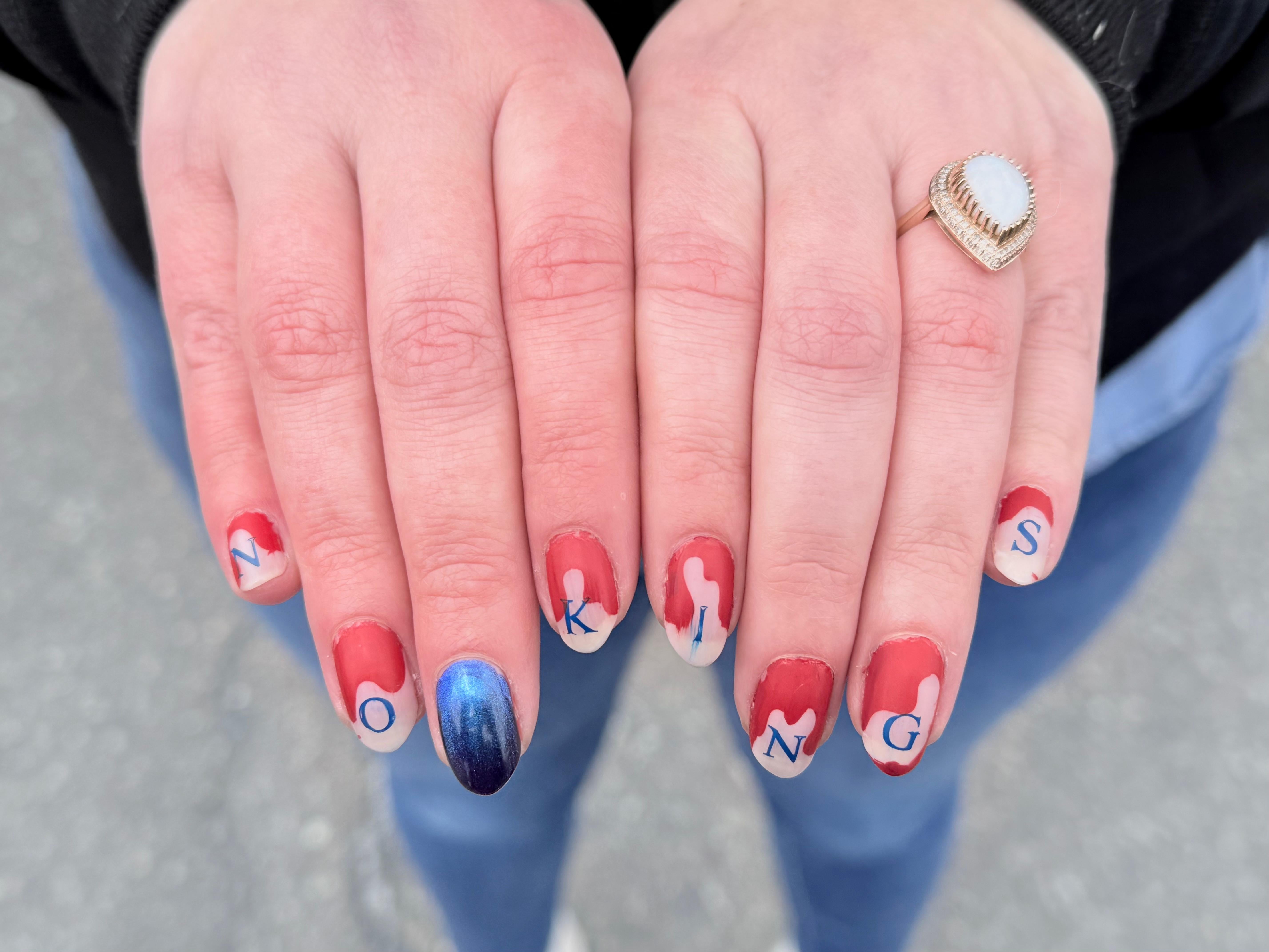 My technique leaves something to be desired: I smeared a couple of letters pretty badly when applying the matte topcoat. I also did this manicure on Wednesday, so it's a little rough around the edges. But I think the concept makes up for it. No Kings, Fuck ICE.