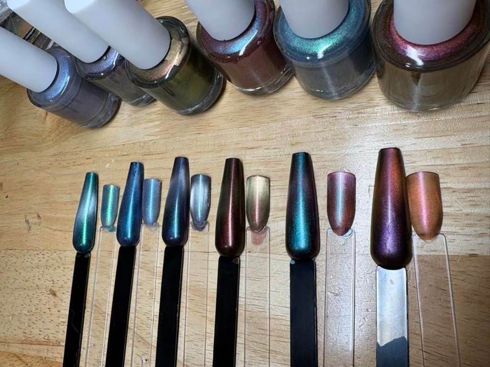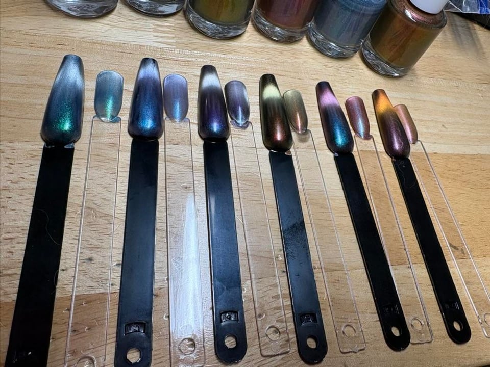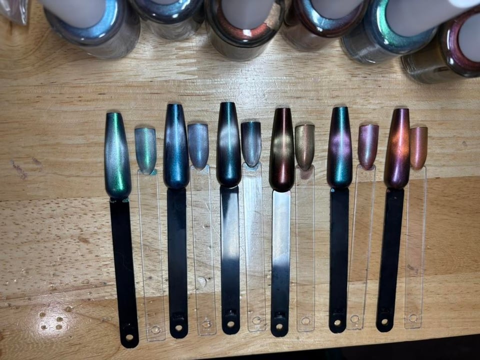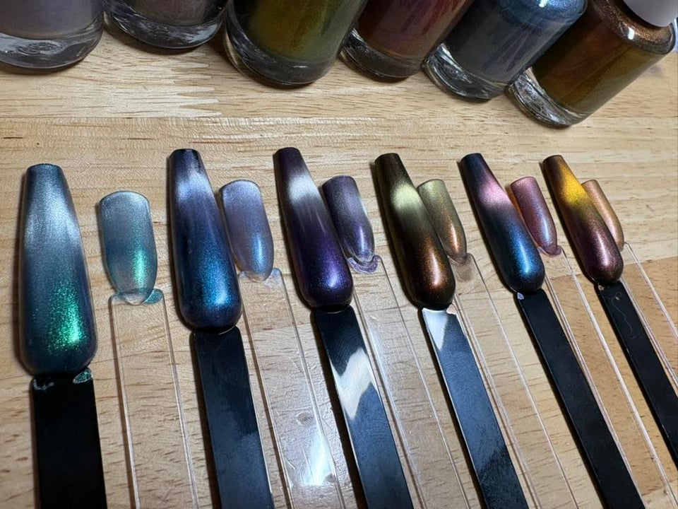 One thing I learned – you don't need as much magnetic powder as you might think you do. The polishes to the left of center actually seem like they have a bit too much, so I'm going to dilute the bottles, probably add a little more of the underlying pigments for more pop.