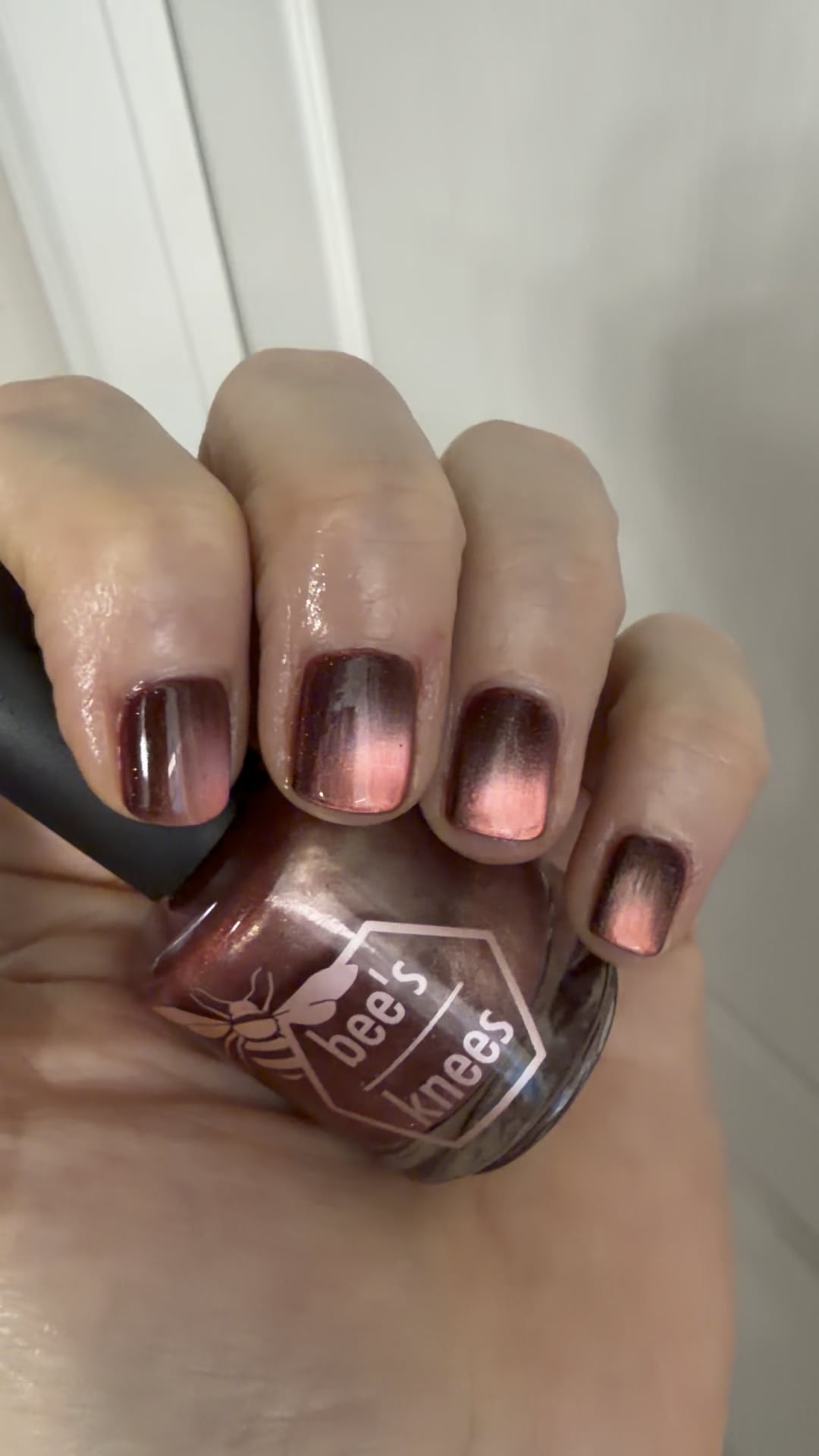 I don’t normally wear reds but this one is acceptable as a rust/desaturated red sort of shade. I think it’s gonna grow on me as the days go by! I used a coat of Nail Tek 2 Strengthen, three coats of BKL Mother Was Mine, and a coat of Mooncat Speed Demon. I magnetized the last three layers using the Etsy 5DPrintFactory Perfect Glass Bead nail tool with a 30 lb horseshoe magnet on top and did 90 sec spins each time. It honestly could have been fine with two coats of polish but one nail looked slightly patchy so I decided to go for three on all and am happy with the outcome and depth it added. The fine particle magnetic did make for slightly difficult top coat application and if I look real close there was some disruption to the smoothness overall but it’s hardly noticeable!