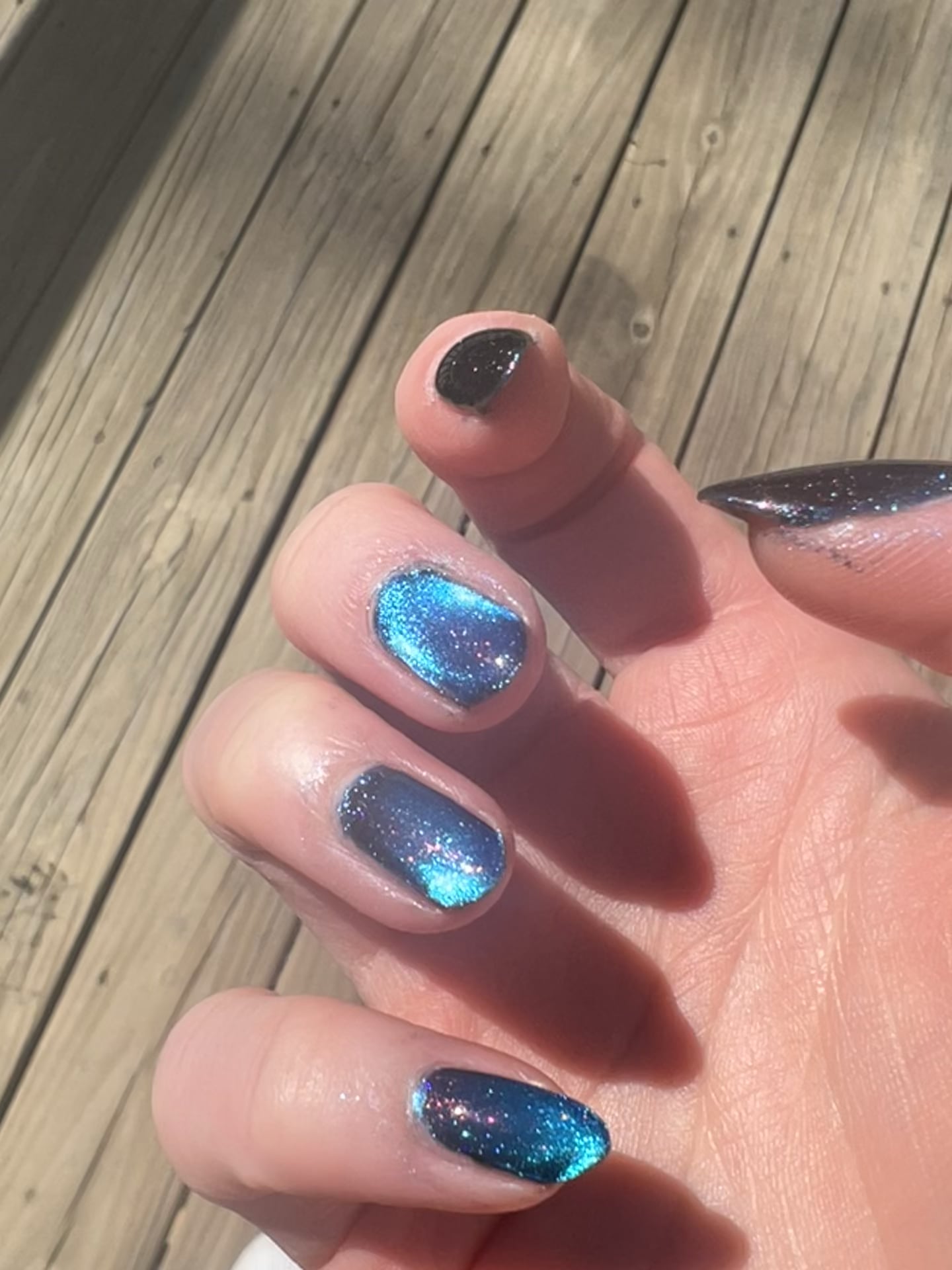 This is Cassiopeia A by Opal Theory Polish, a new-to-me brand. I am mesmerized by the shift! Magnetized it with the 5D glass bead device with a 30lb horseshoe magnet on top. The turquoise is so bright in the sun! by industriousvirgin