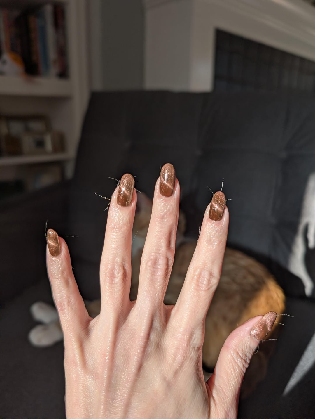 It was my first time using DRK's Seal Glaze, and I am a convert, my magnetic effect stayed in place! Cat tax of Curly Fry in the 2nd pic.
