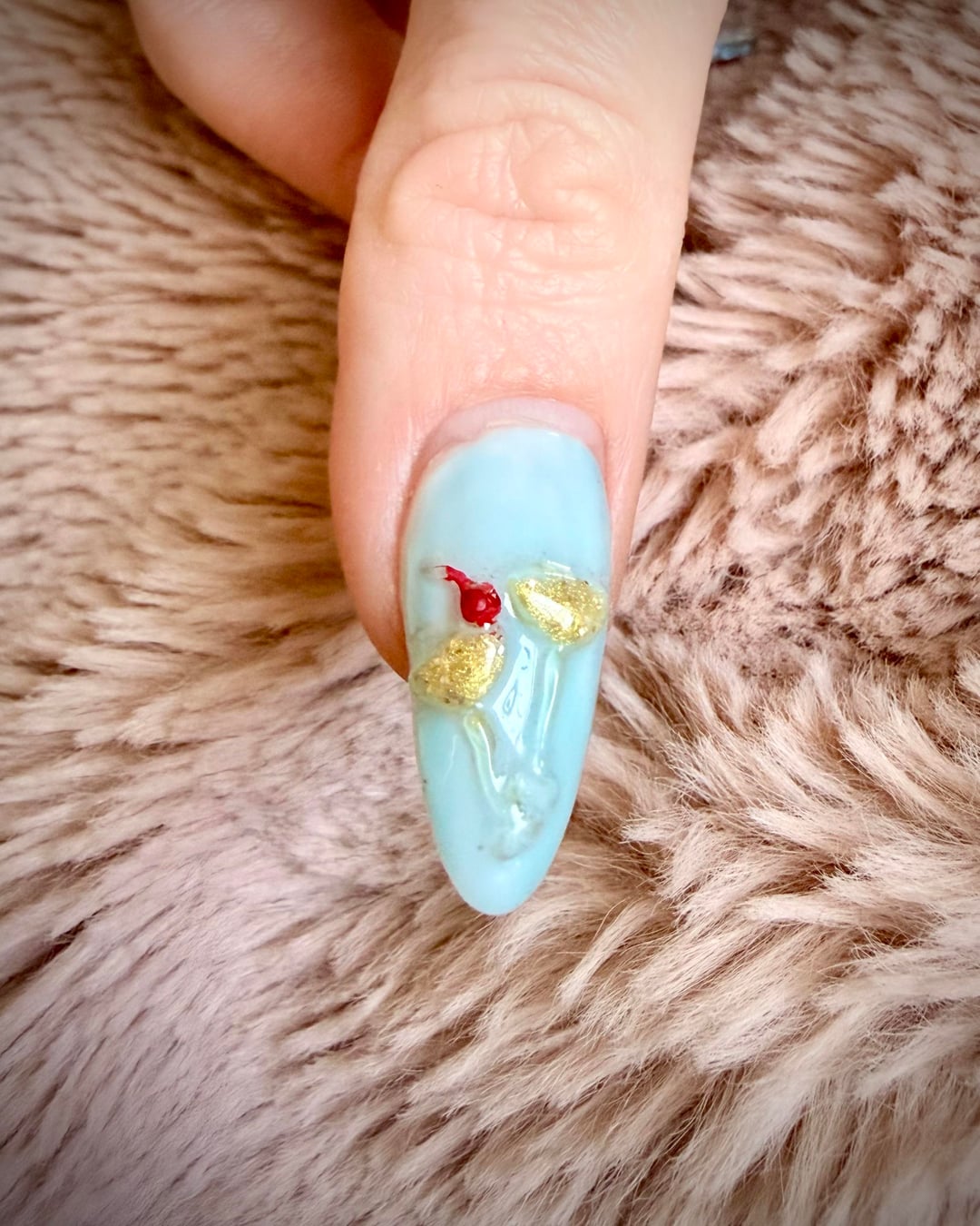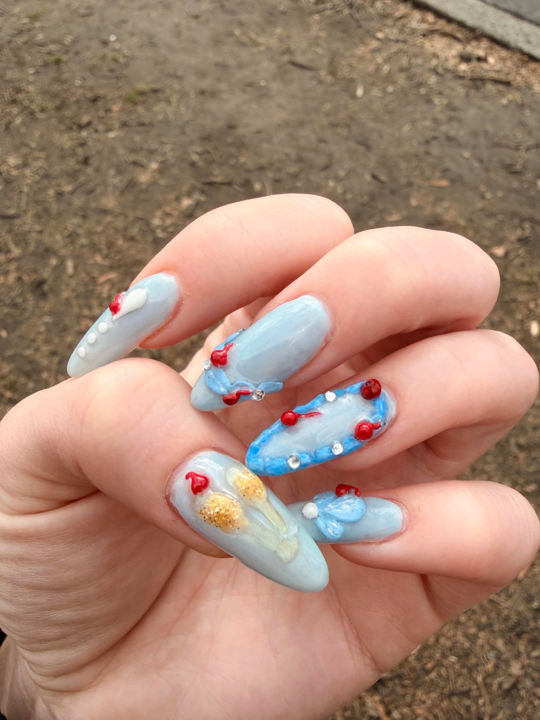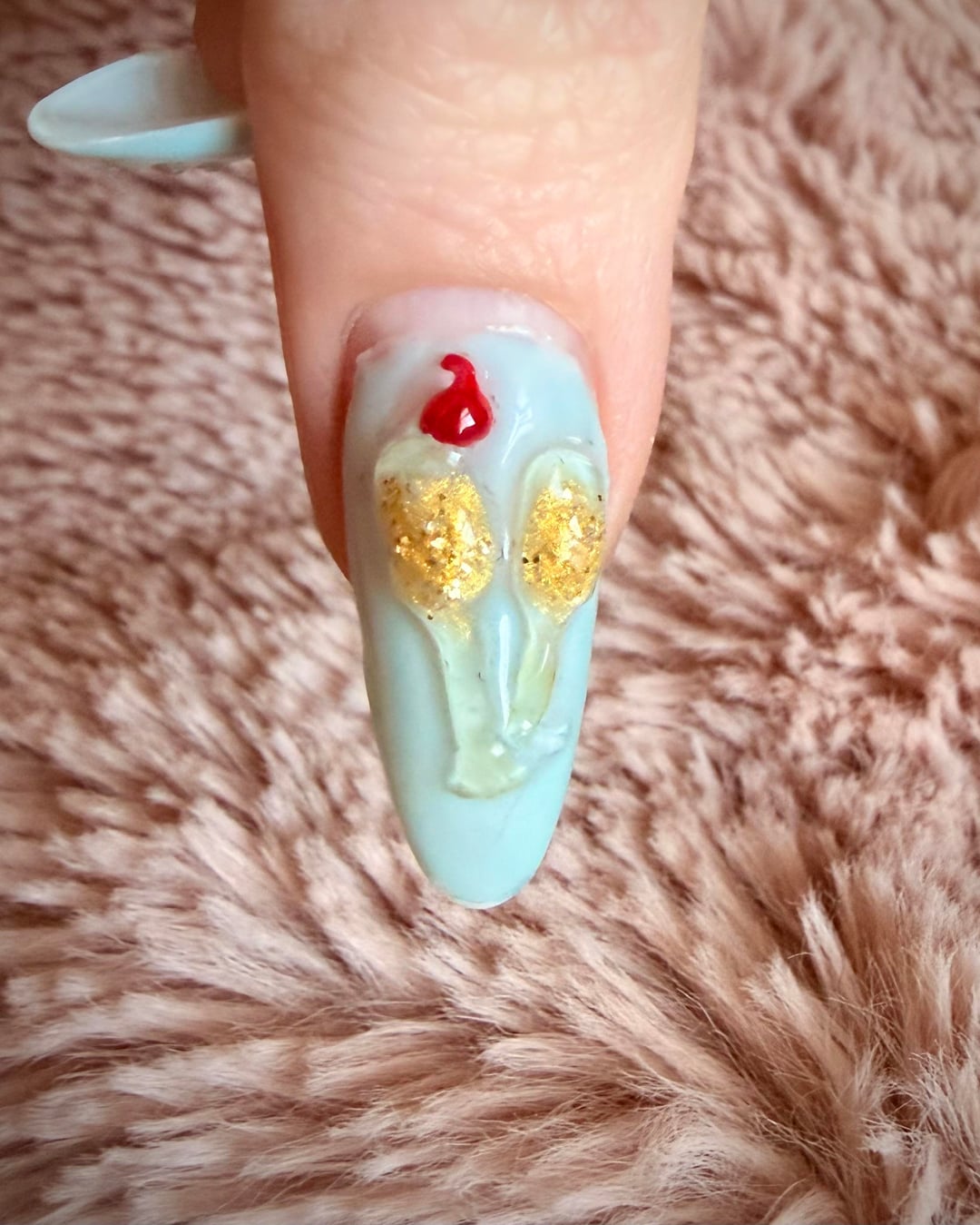 Hand-sculpted with low-viscosity boba gel. Would do it with a more firm gel to get more icing-like texture. Not sure how to do the cherry stems better, that was a bit of an ordeal and the 1 that was upright was ripped off within an hour.