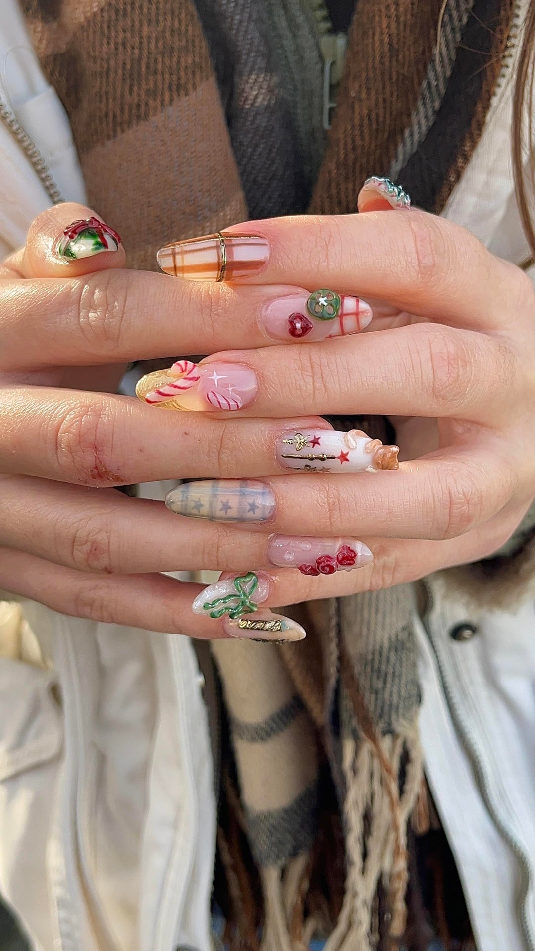 honestly too good not to post. did these on myself this december:) ima probably start posting all my work over here haha!! lasted me 5-6 weeks, gel on natural nails. everything is hand sculpted/painted by sunnemi