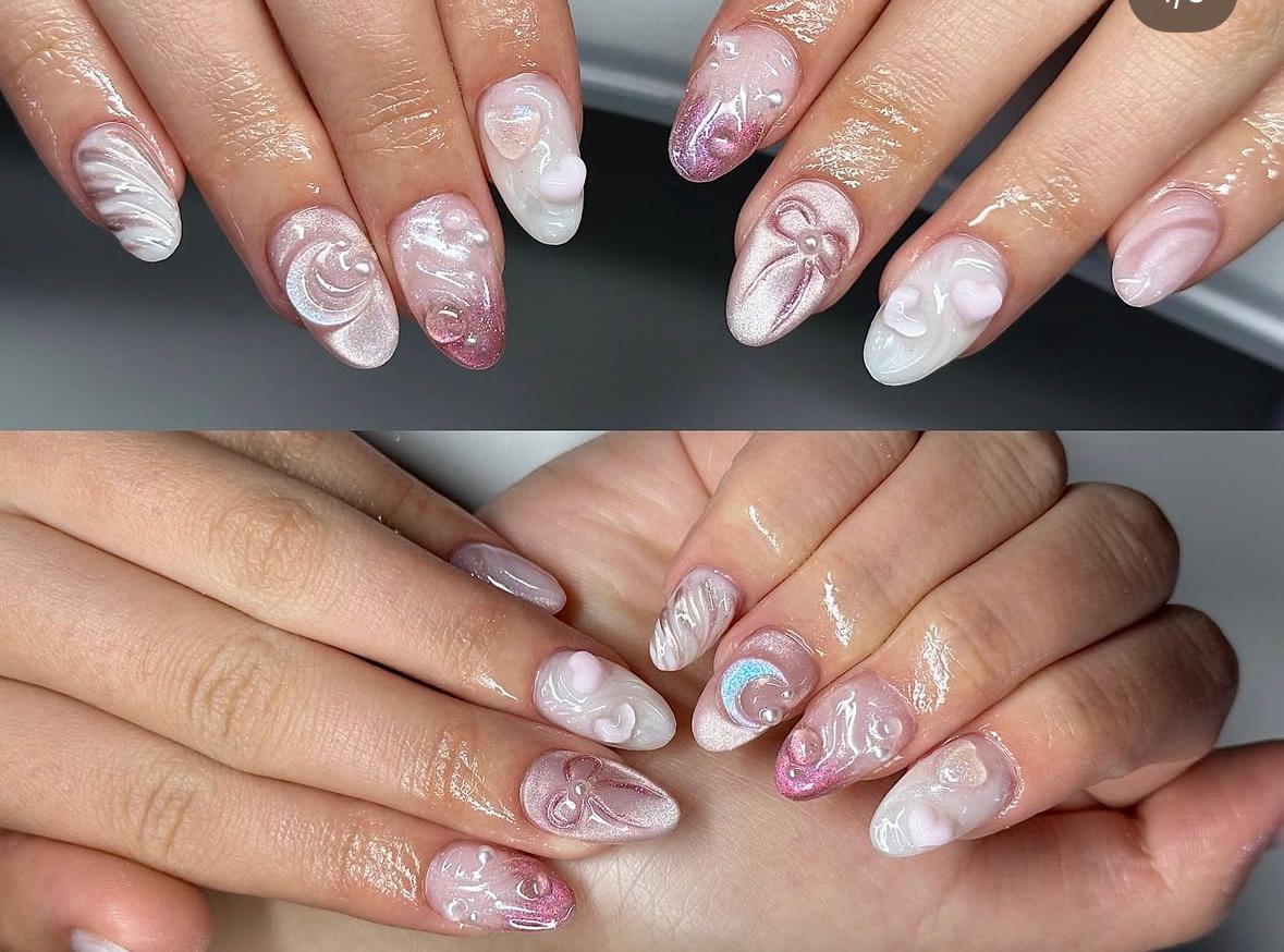 I do my own nails at home as a hobby. Can someone tell me how to achieve the 3D Cateye looking nail art? Specifically the moon and bow!