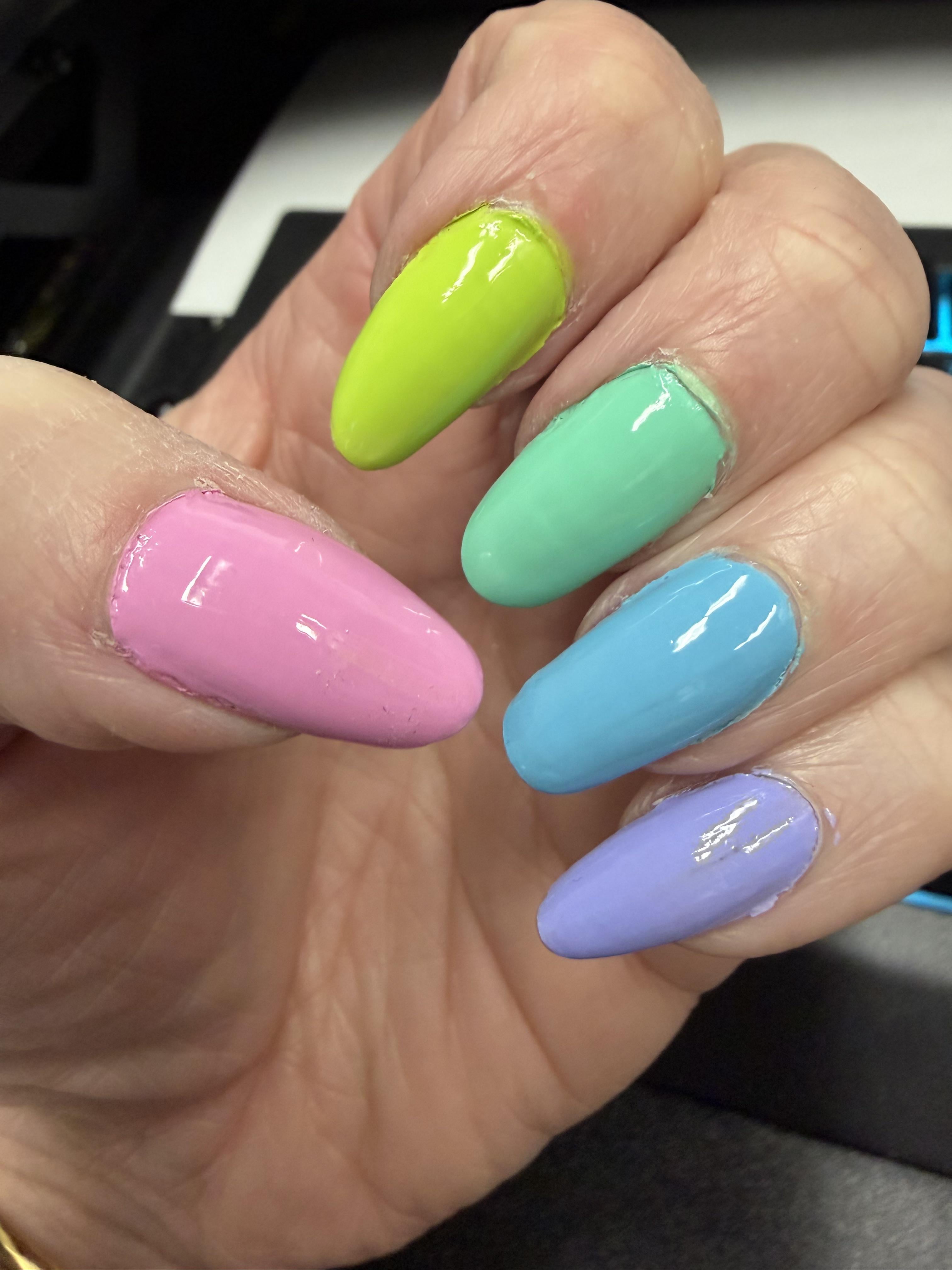 My annual Easter skittle! Normally it’s a little more pastel, but these are some cremes I got here and there from mooncat so I put them all together and I’m really pleased with it! Just ignore my cuticles and such, I’m not patient enough for a full blown manicure on myself 😅