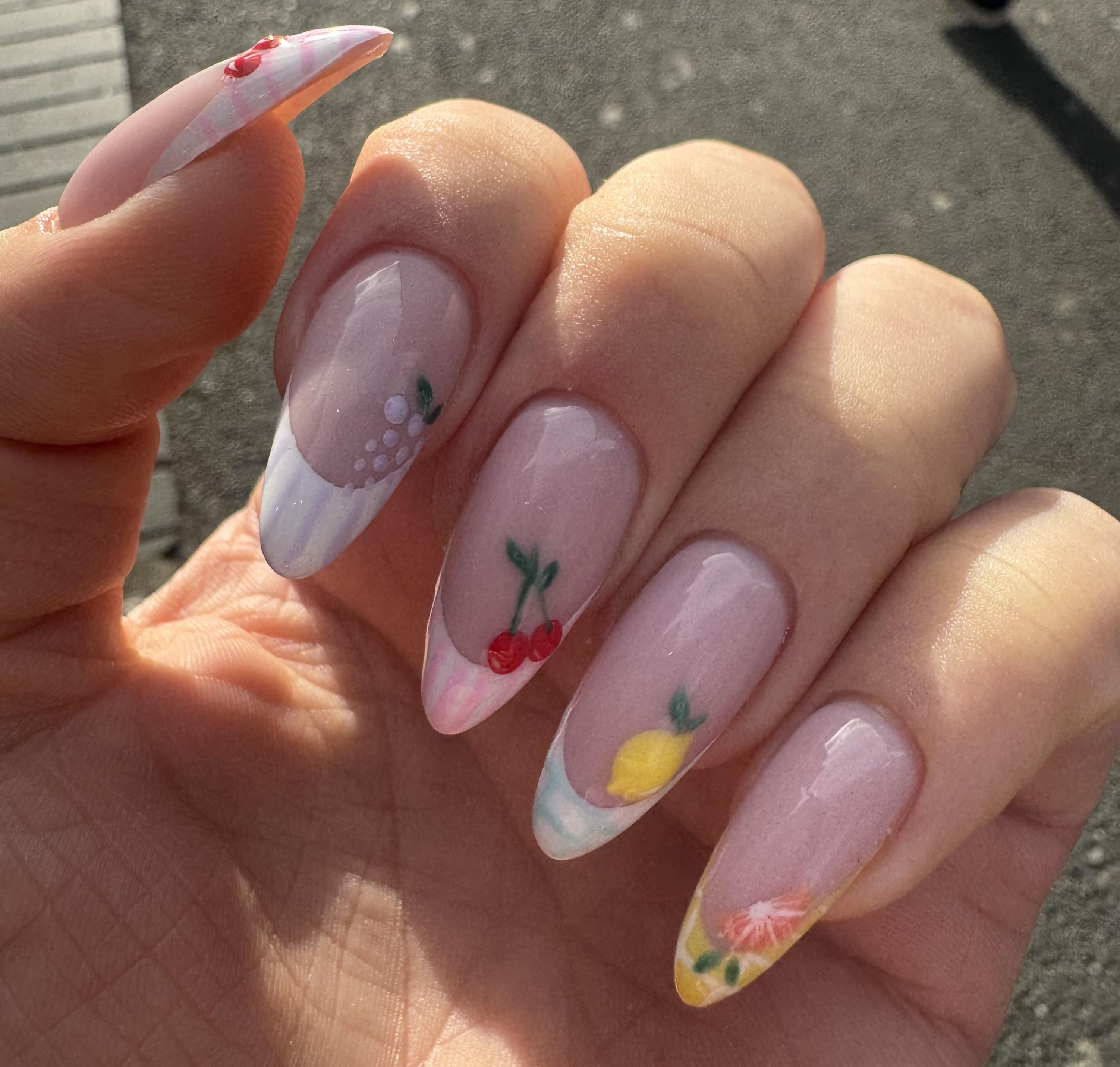Very different design from what I usually get but I love them! Hard gel overlay with fruit art 🍒 by cultofmedea