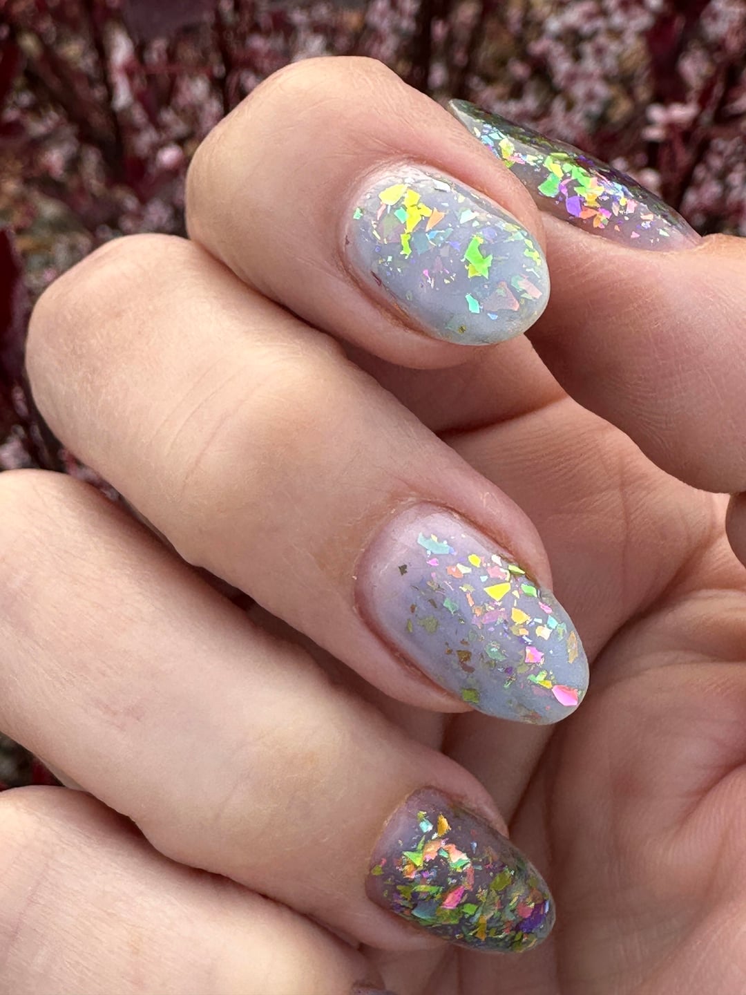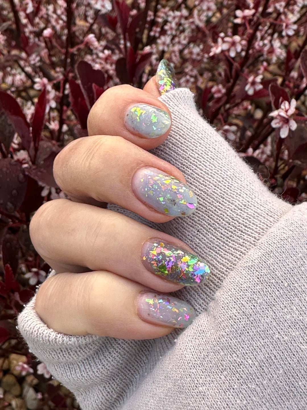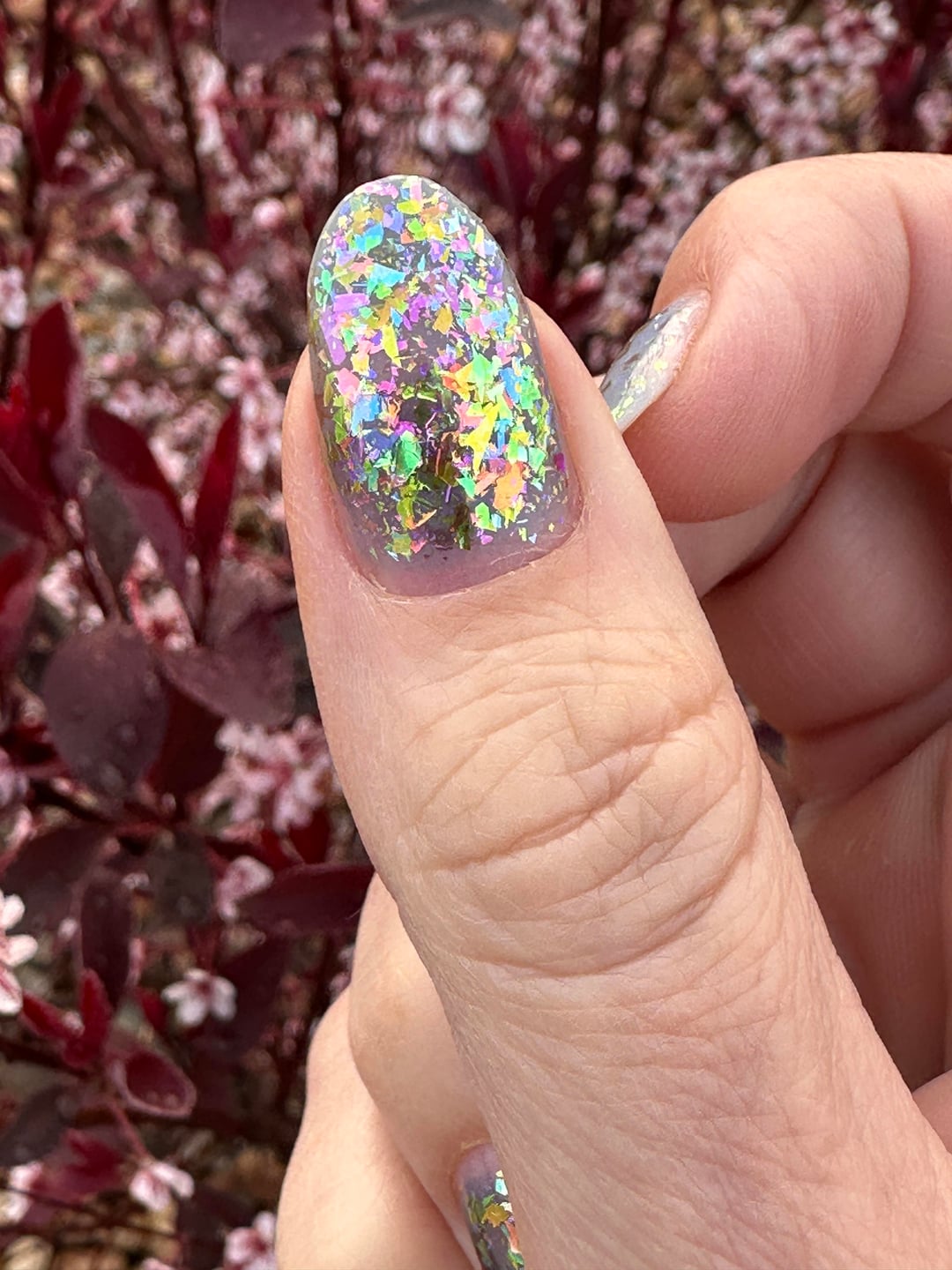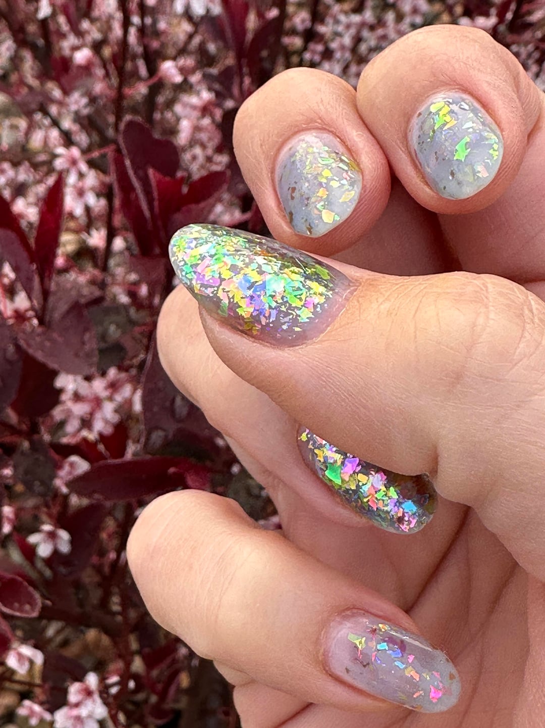 We finally got moisture here in CO and woke up to fog, of all things! I had to stop on the walk home from school drop off to get a few pics of my moody yet insanely iridescent mani in the diffused light. (Excuse the dry cuticles—I hadn’t even had coffee yet, let alone done any self-care! 🤣)