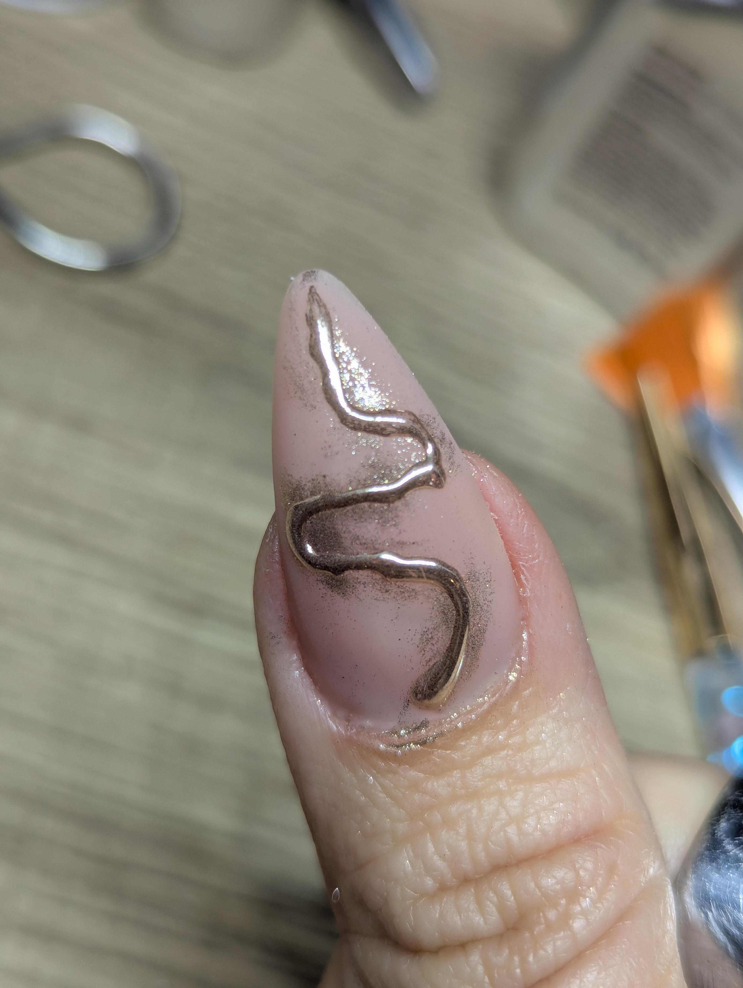 I use a matte top coat before applying the design shape with the no wipe top coat, and then rubbing the chrome on it. What's going on? Is my chrome powder low quality? please help 😭