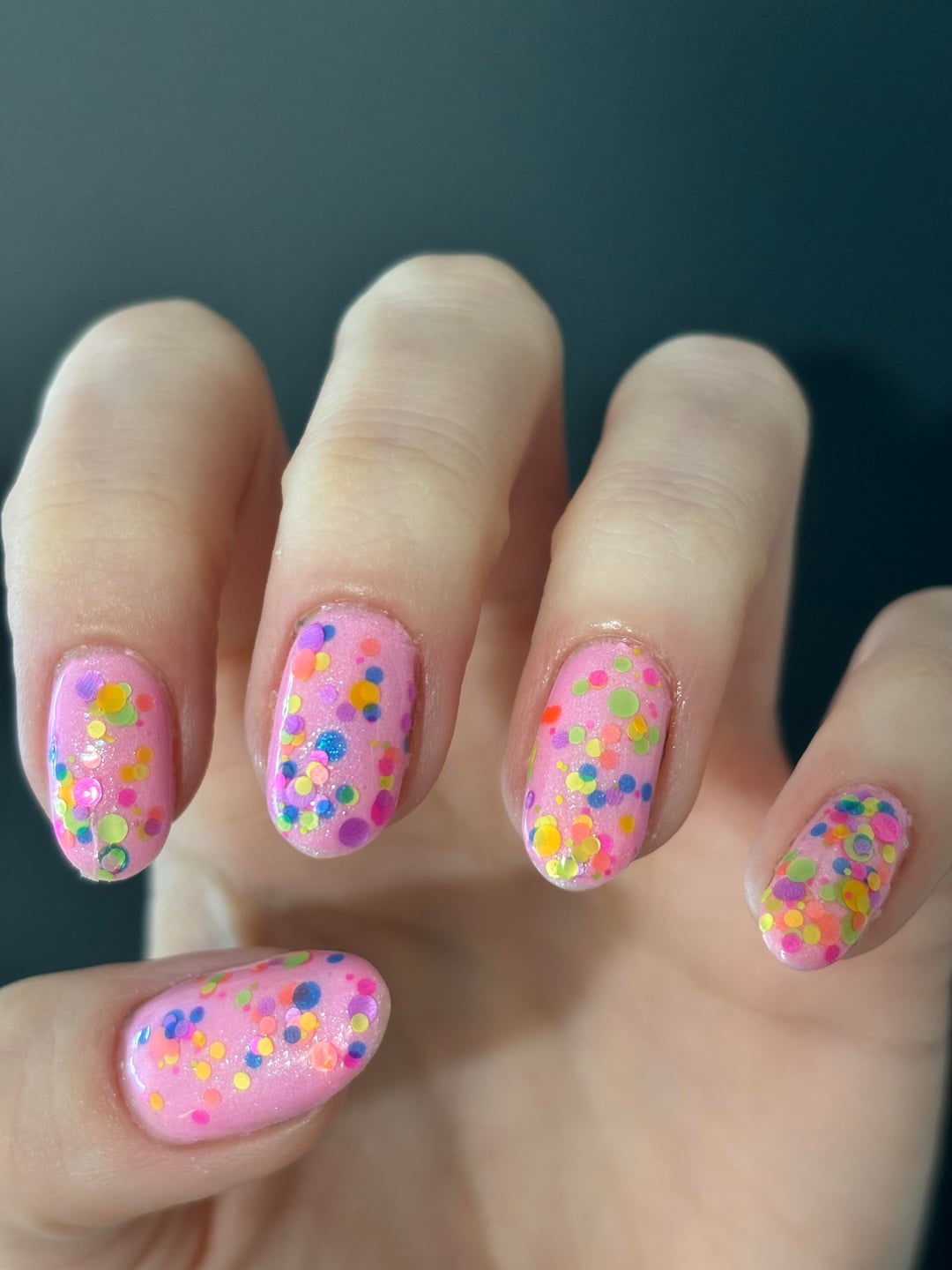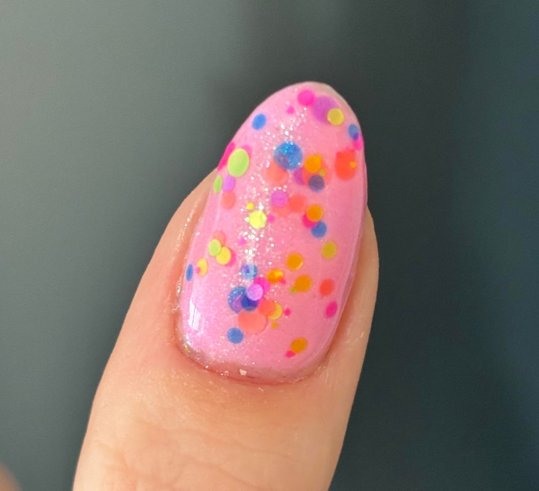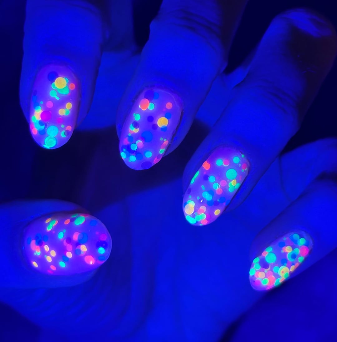 So, I chose this combo because I thought it reminded me of Easter eggs in a roundabout way, and it seemed like fun to use a glow-in-the-dark base color under the topper.