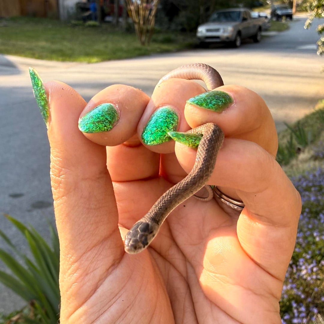 hacelepues on April 3, 2026 3:22 pm I found this friendly little guy while pulling weeds in the garden 🙂 Products used: Base: Morgan Taylor Stick With It 3x Mooncat’s My Cabbages! Top: inm Out The Door Snek: Dekay’s Brown Snake. I’ve found a few of these little guys in the garden recently and it makes me so happy! They eat slugs 💚🐍