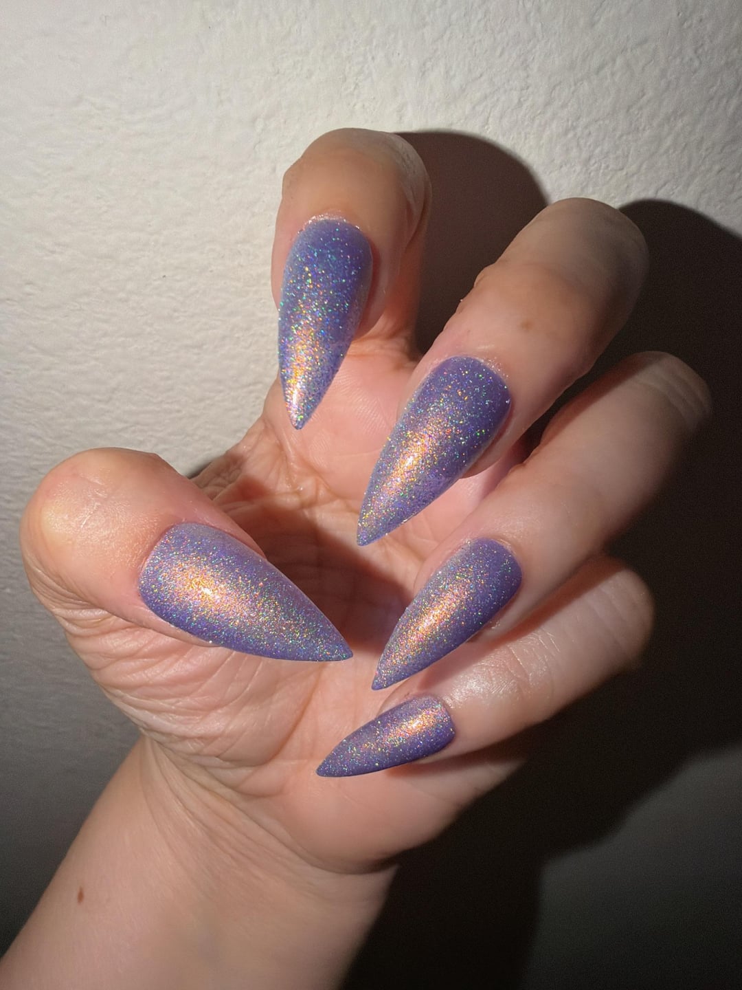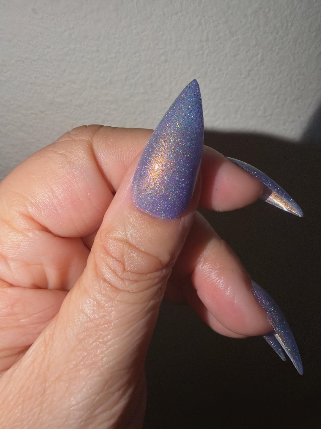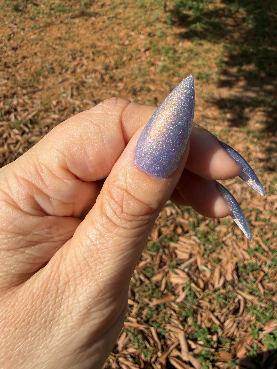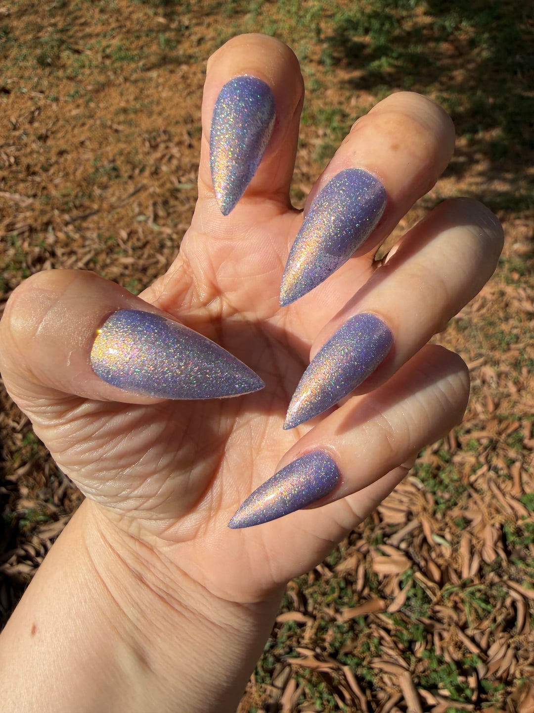Cool periwinkle base with fine holo shimmer. Reads soft and slightly dusty in lower light, but the sparkle comes through a lot more in the sun with scattered rainbow flashes. Smooth, glassy finish and evenly distributed shimmer across the nail.