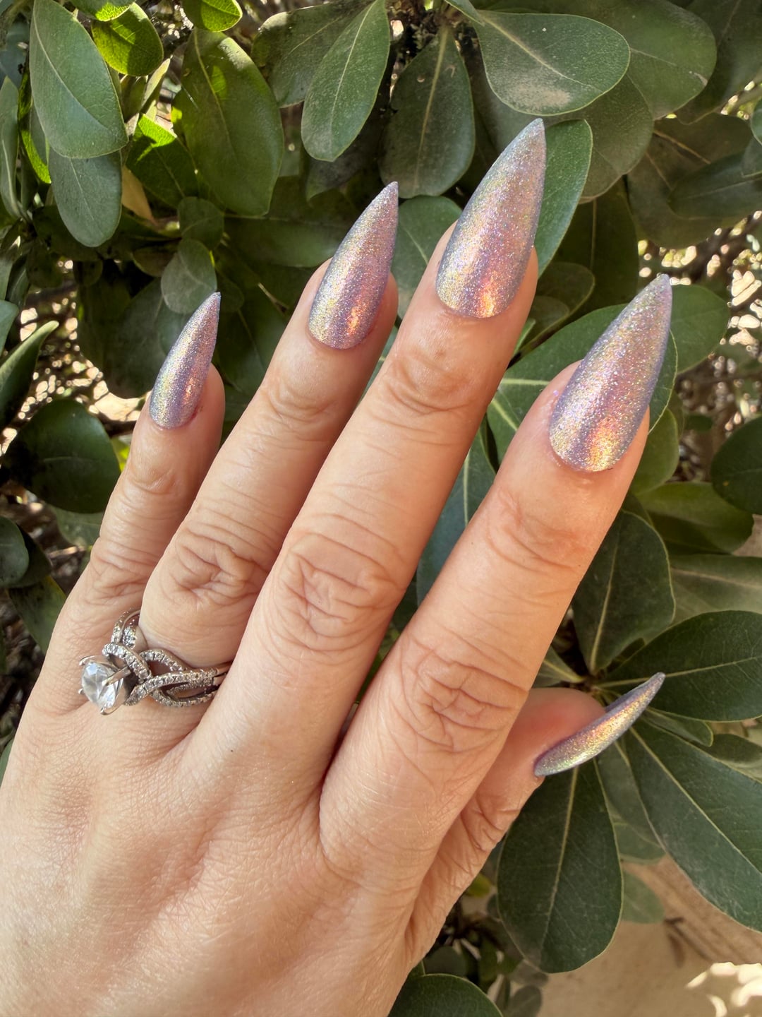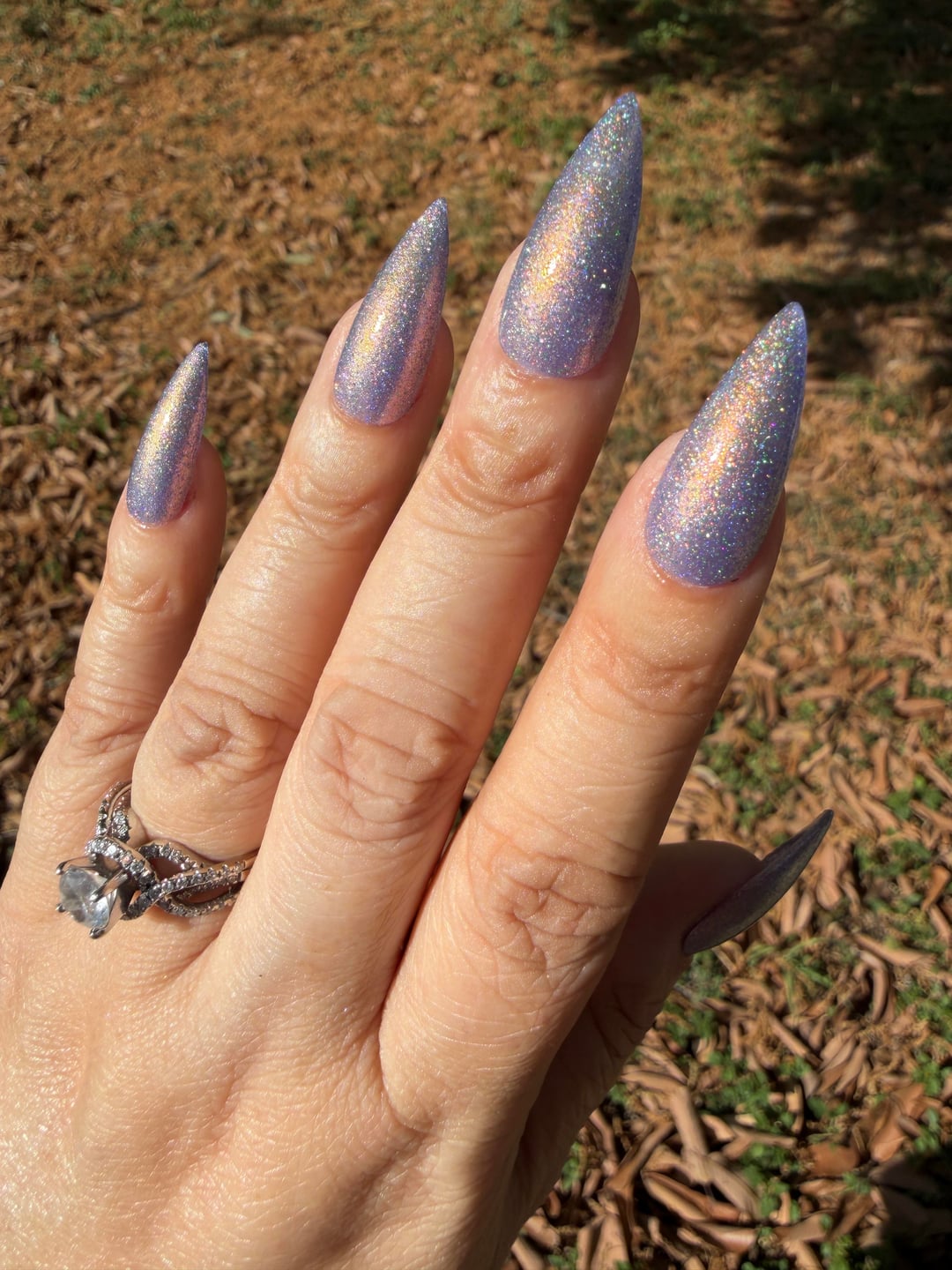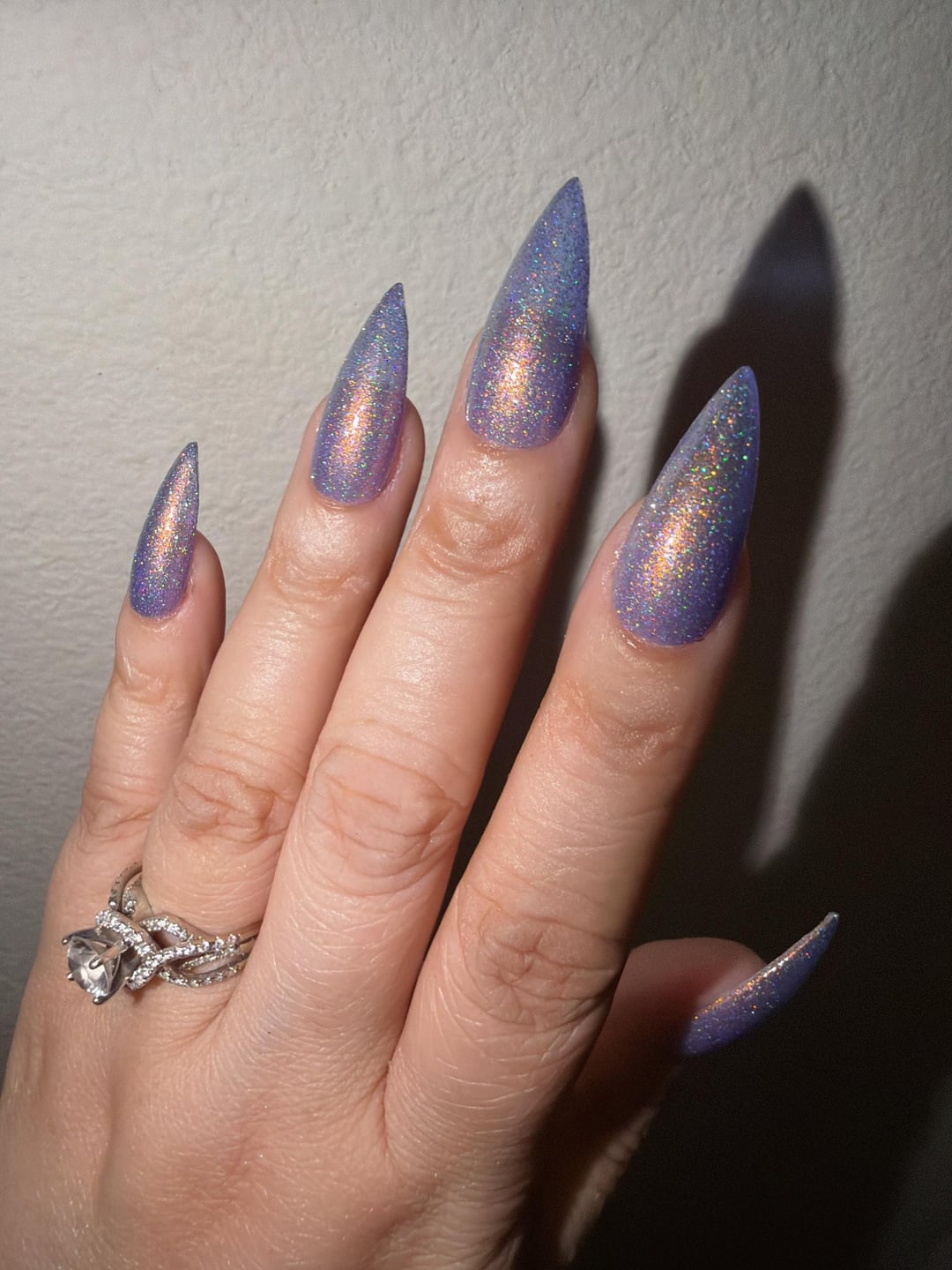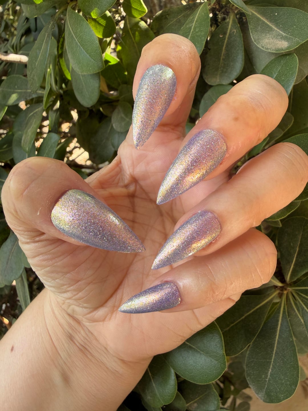Cool periwinkle base with fine holo shimmer. Reads soft and slightly dusty in lower light, but the sparkle comes through a lot more in the sun with scattered rainbow flashes. Smooth, glassy finish and evenly distributed shimmer across the nail.