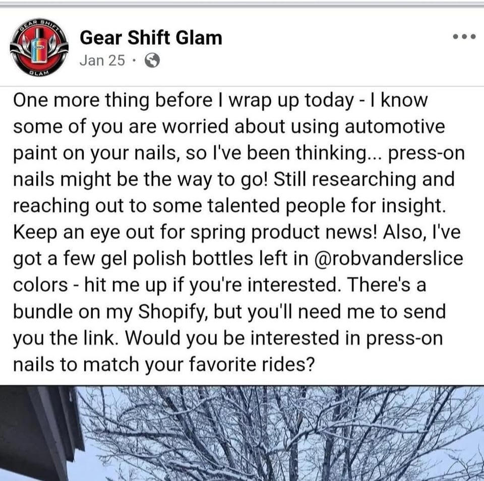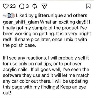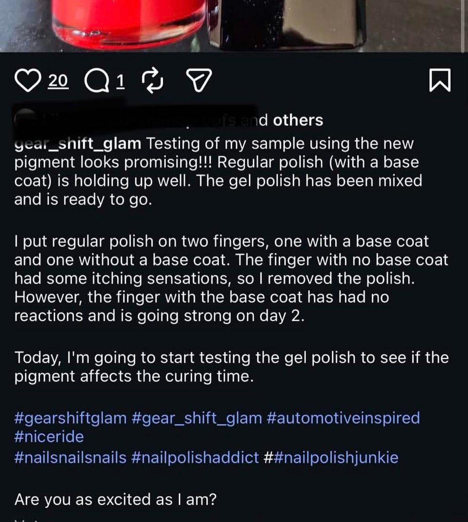 Gear Shift Glam is using actual automotive paint in their polishes in a 10 to 1 ratio. Not the raw pigment… Paint that has already been mixed for automotive use. In an IG post, the owner is saying it caused itching and is considering only using it for press ons or enhancements, which is extremely concerning. But this info is NOWHERE on their website, which seems dangerous for anyone buying it who doesn't check their socials. They also are making gelpolish with it but they don't know if it affects the curing time? I just wanted to warn everyone because this seems unsafe.