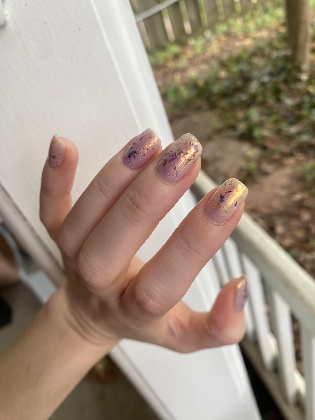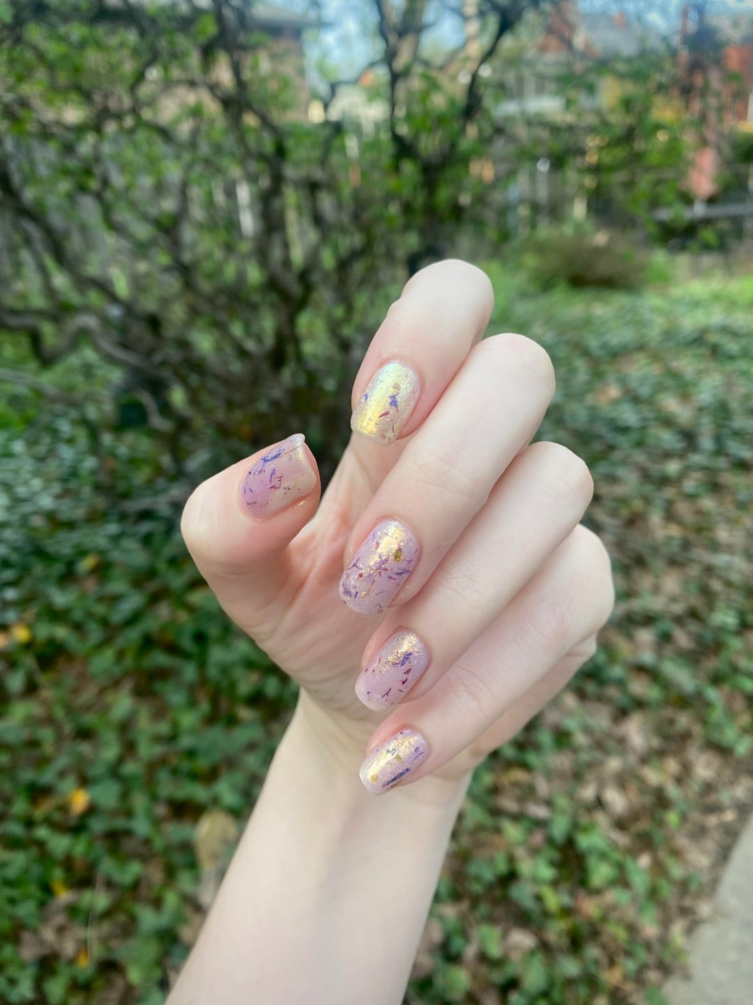 I bought three polishes and a nail oil from the Holy Order of Perpetual Lacquer and i am so happy with all of them 🪐 Warding is so golden and sparkly. I was a little worried the shimmer would cover the flowers but they end up looking so beautiful together. So magical and perfect for spring.