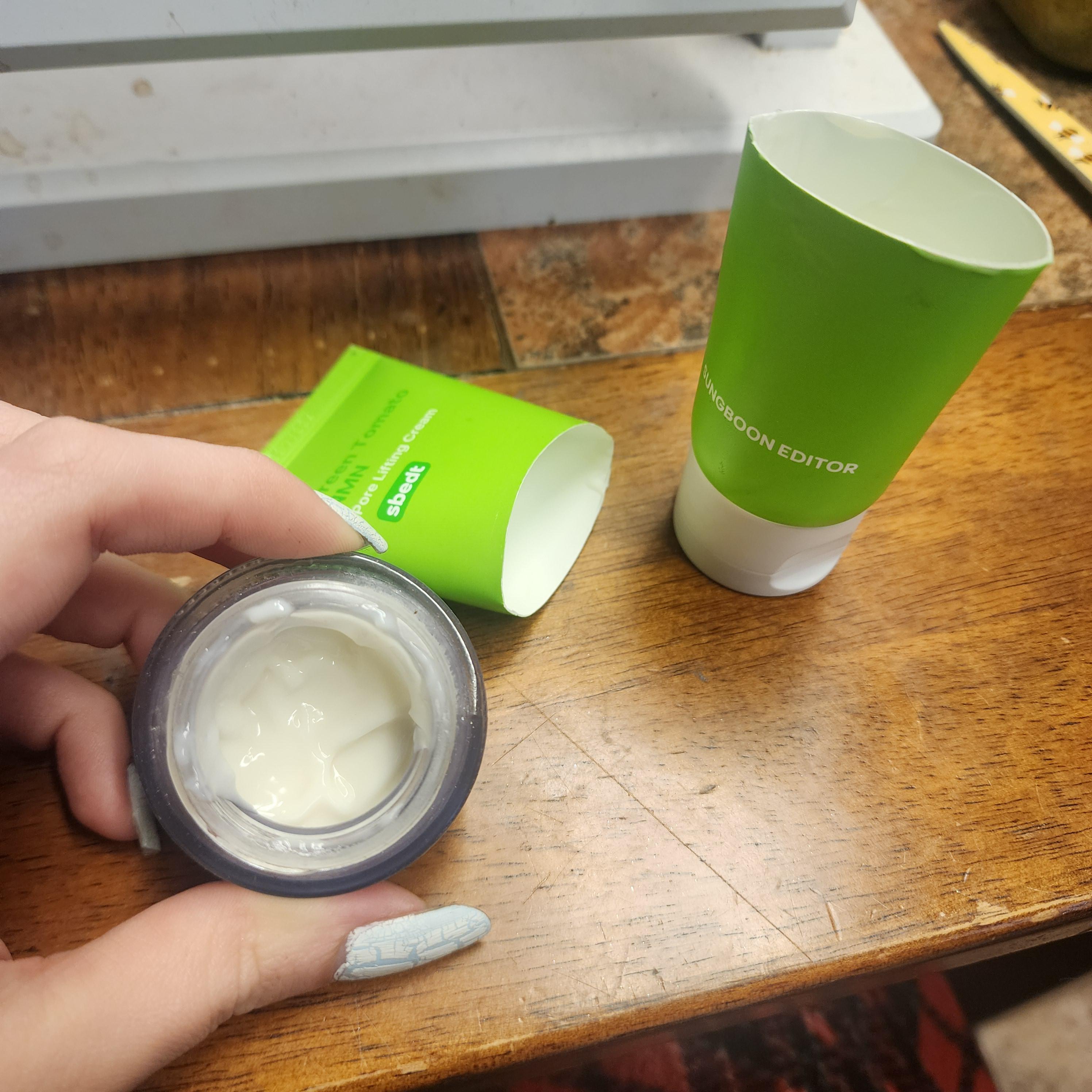 This is the Green Tomato NMN Pore Lifting Cream by Sungboon Editor. I use this as a moisturizer in the morning. I don't know if you're supposed to do that, but I do and this stuff legitimately saved my face. I'm blown away.