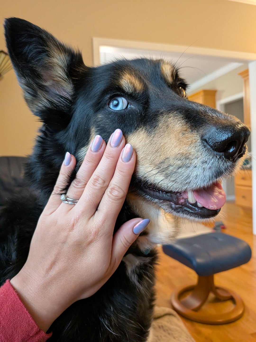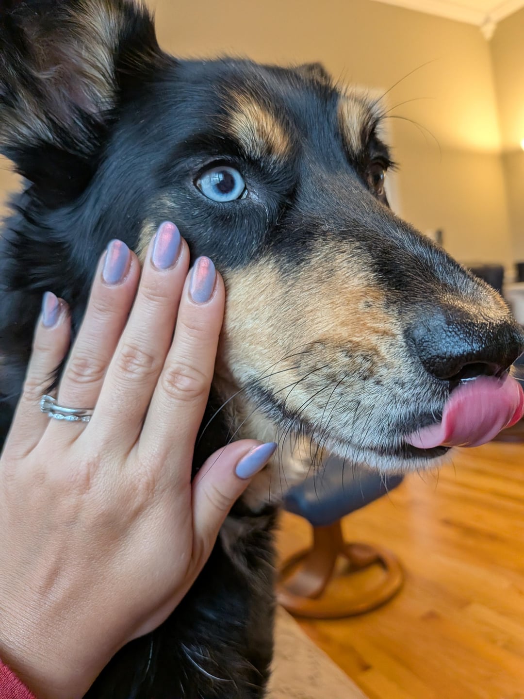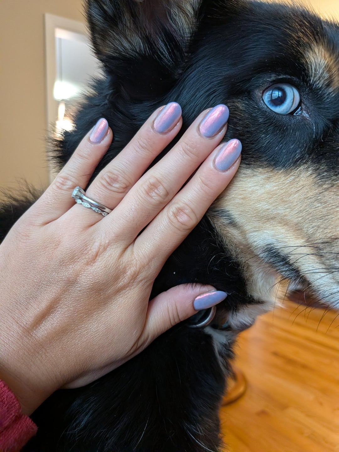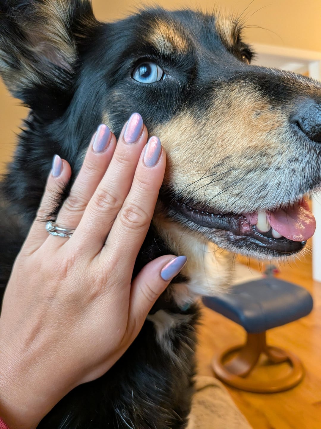 Wasn't sold on this color until I tried it against my dog Noodle! The base looks way more vibrant against her black fur. She is normally a wiggly girl but today she wanted to help me pose with my nails.