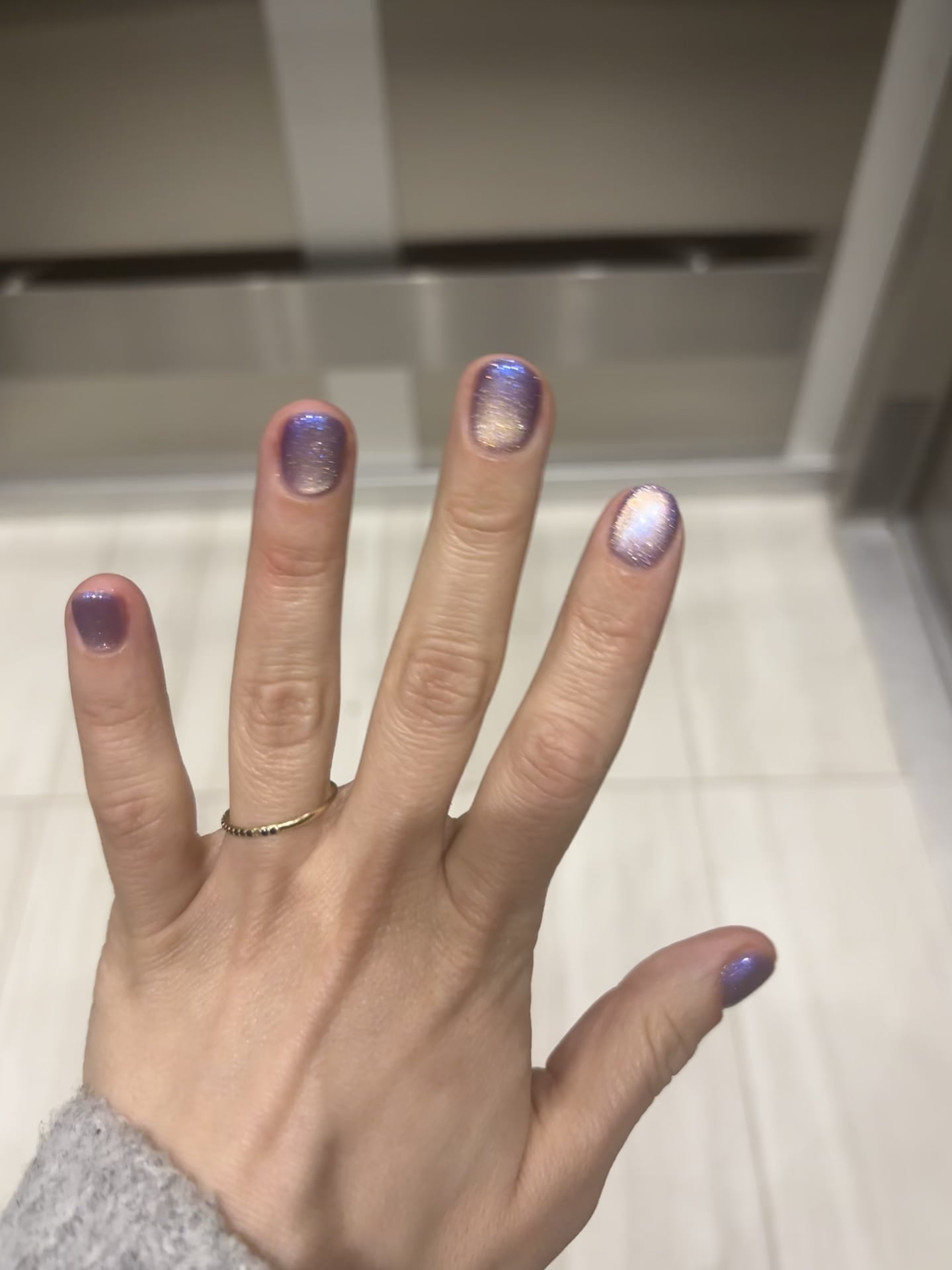 Two catseye polishes layered- a lavender and then a silver on top. Not sure what brand my salon uses, but very pleased with how it came out! by petrock_915