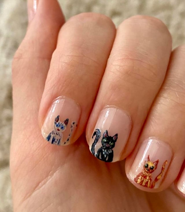 Don't mind the cat hair photobomb, lol. Here's a mani I did a few years ago (2022)! Each little kitty was hand painted, I used some craft paint and some regular lacquer. I obviously needed to float my topcoat better because I did get some streakiness, but I'm still proud of how cute these little kittens came out.