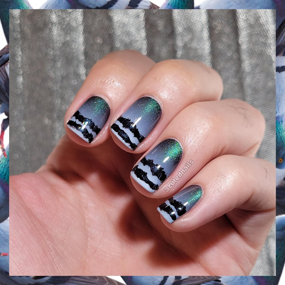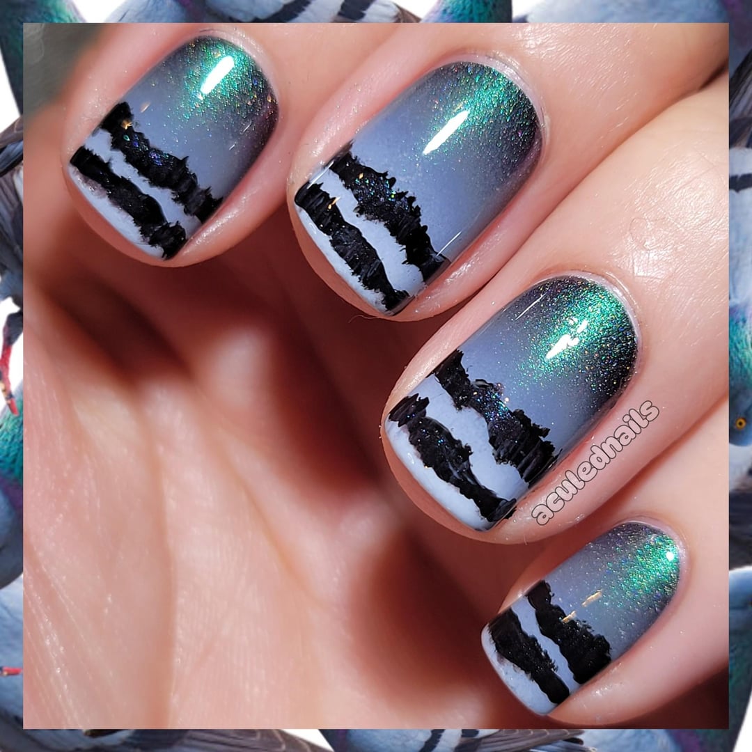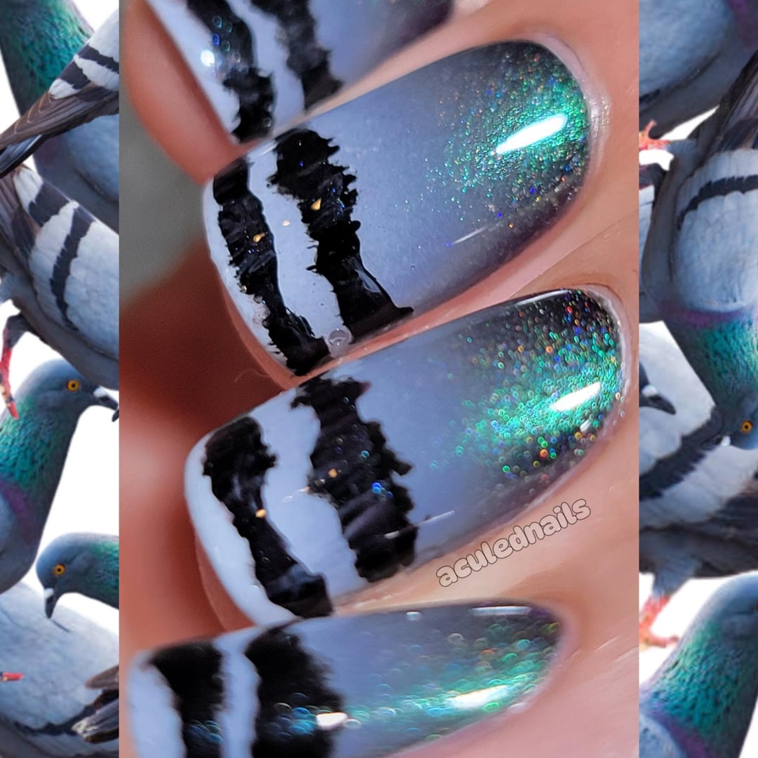 So, those who know me may call me a weirdo. They would be correct. I’m the type of person who has endless curiosity and will spend hours nose diving from article to article in an encyclopedia. Over the weekend I sat and watched two of the Rock Doves (aka pigeons) who took up nesting in our neighbors roof and frequent our bird feeder camera for a long while…and in turn went on a 45 minute research binge, learning about their genetics, habits, history, and physiology. Of course…this meant I needed to make them into nail art. This coloring and pattern is called blue with a bar wing pattern, which is just one of dozens of color and pattern variations. The iridescent neck feathers meant I needed to whip out an OG Tyler’s Trinkets multichrome and do some gradients woth that bitch. I have pidgeon nails. This better take off, you heard me Hailey Bieber…let’s make Pigeon Nails the next nail trend of 2026.