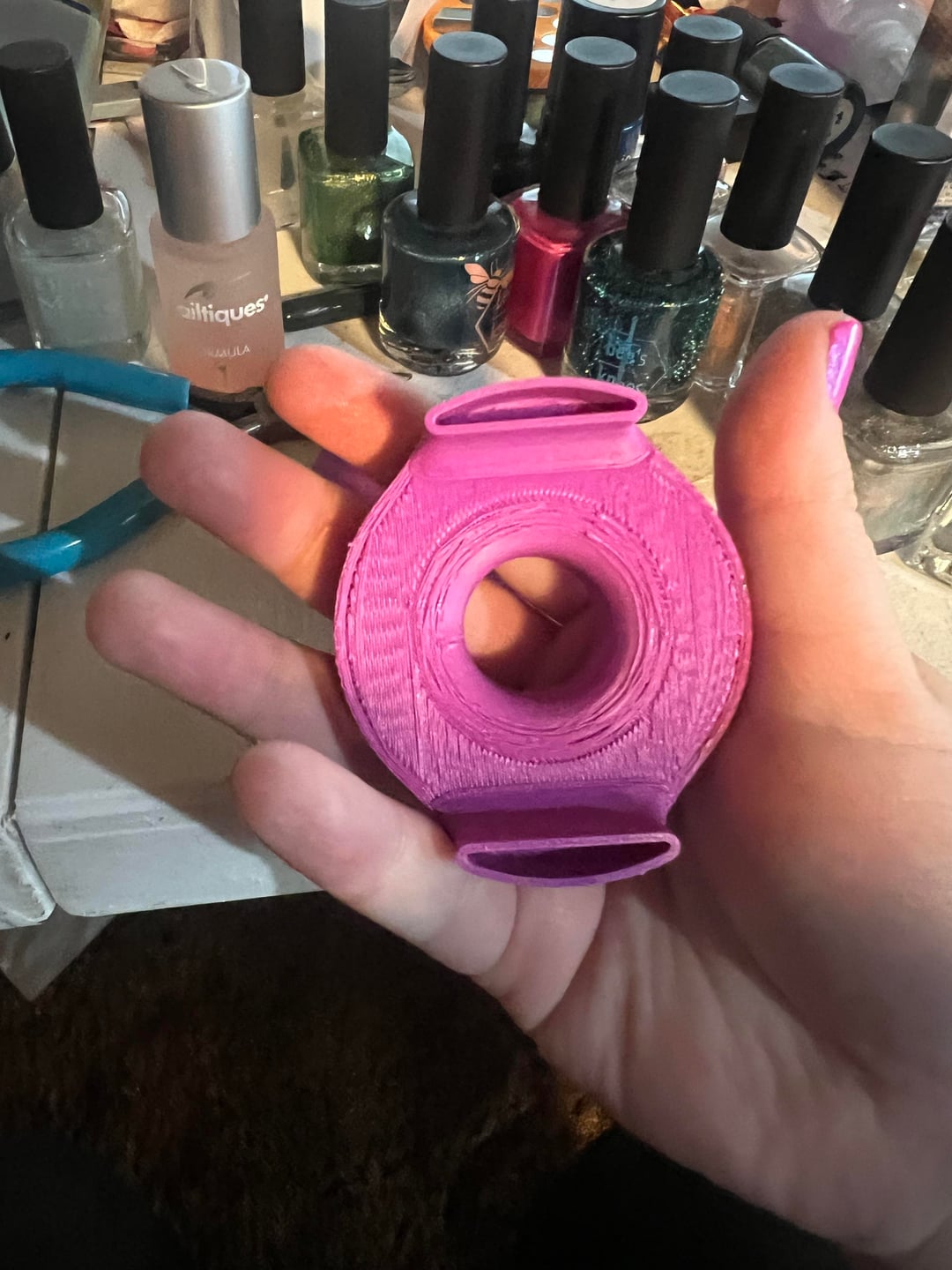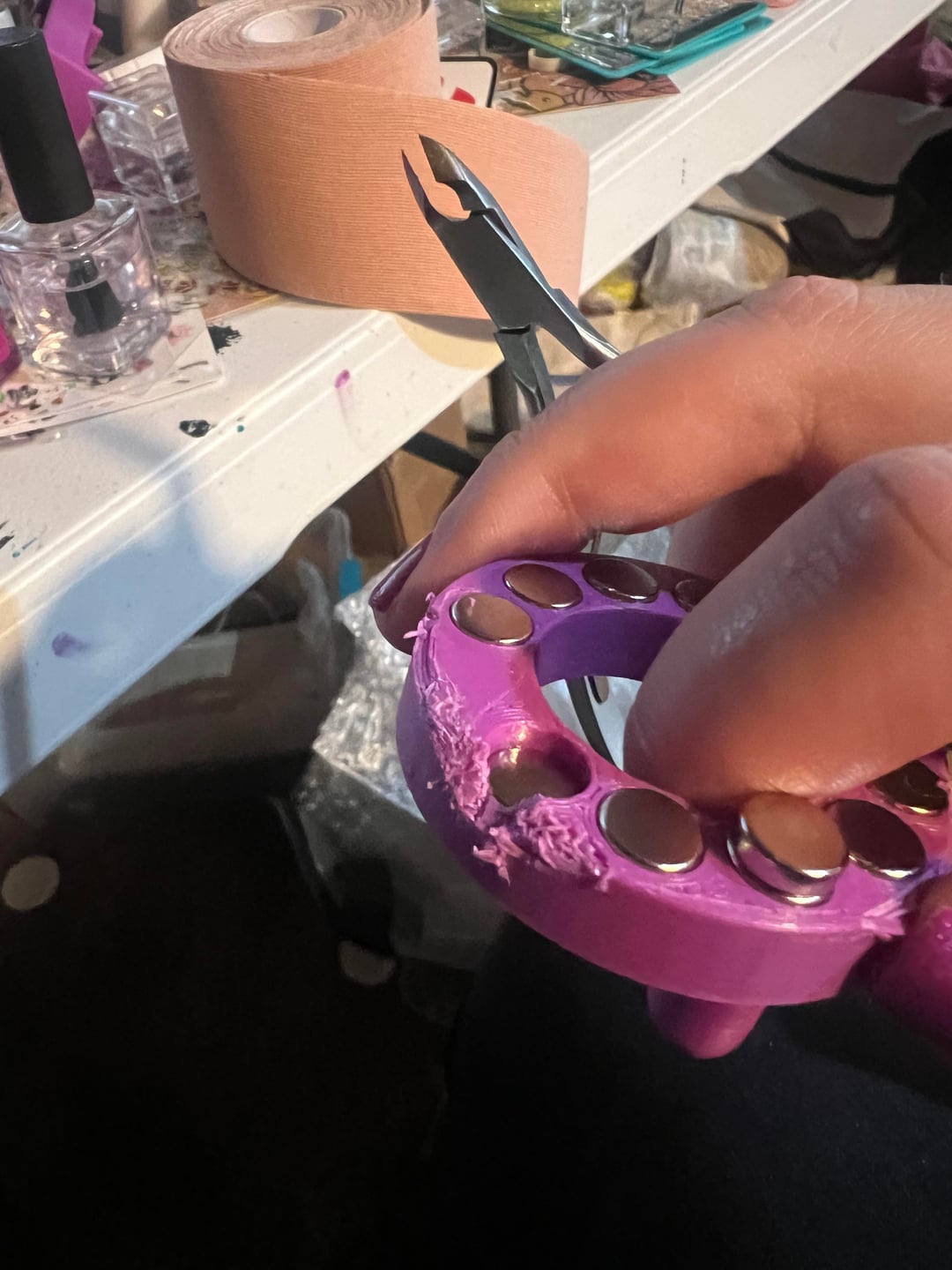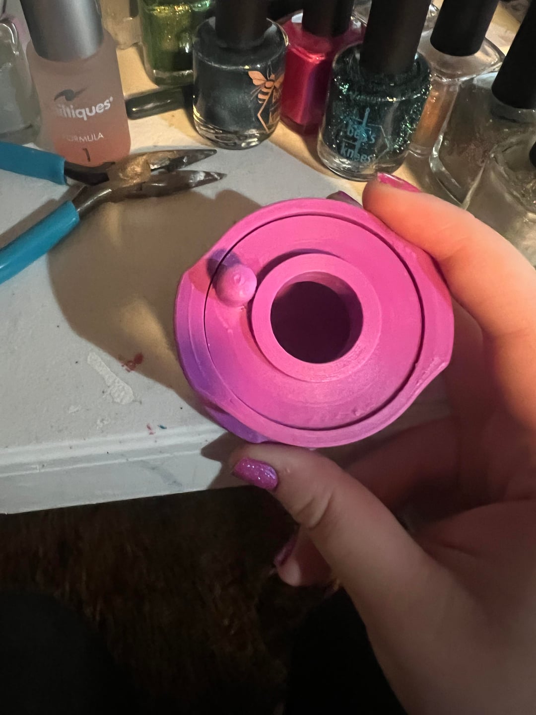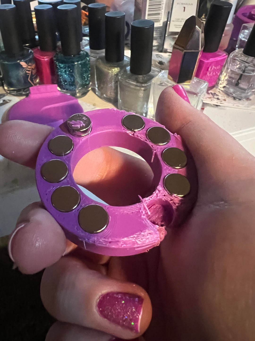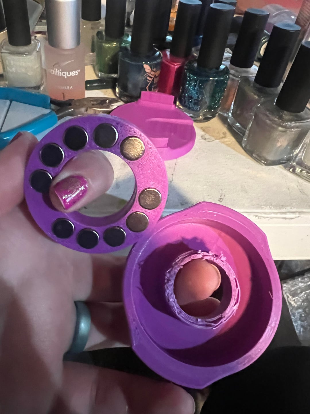 However. The magnets stick down below the plastic of the spinning part by about half a millimeter. I’m not sure what happened, but this might be a measurement error. This adds a bunch of friction, because the lower surface is grooved from being 3d printed. I originally added a lot of cuticle oil (what I had on hand) to help, and it worked pretty well. However, I also taped the top to the bottom part (to help keep things aligned properly) and after a few days of sitting, the oil had seeped through the printing lines and gotten everywhere.