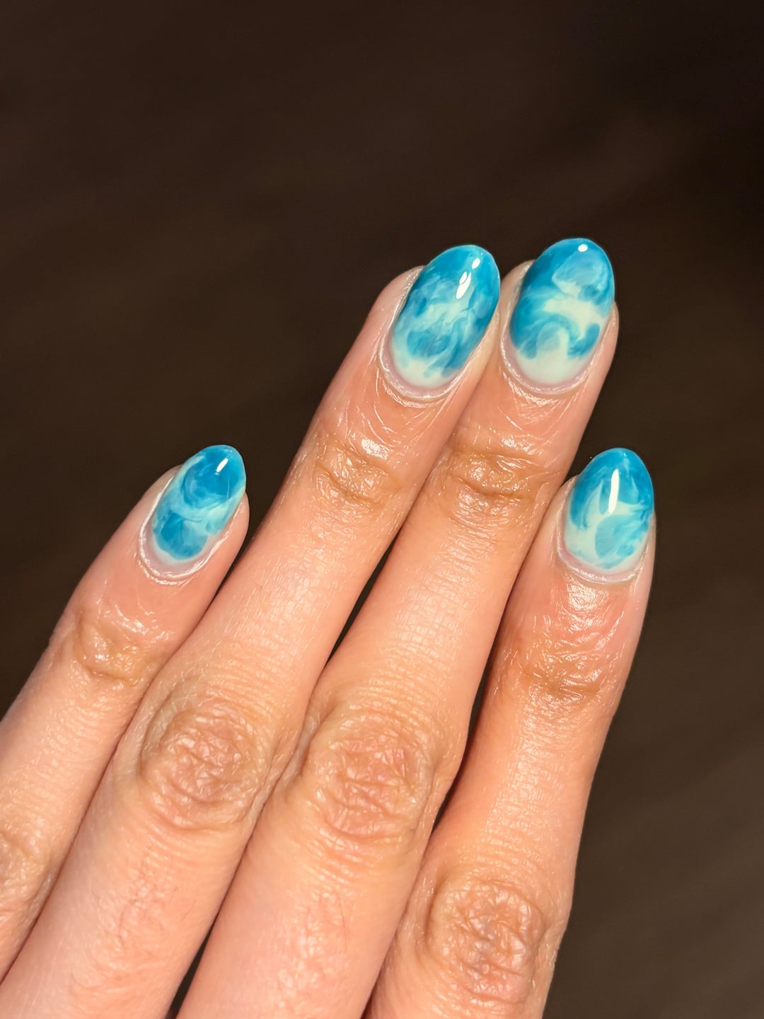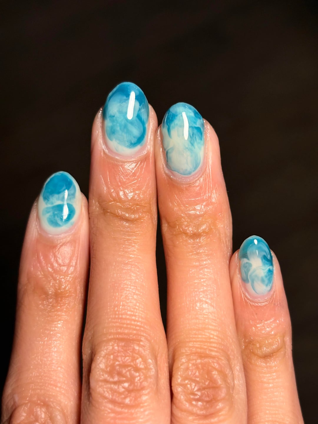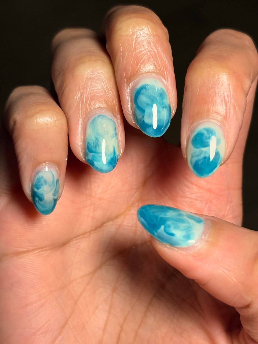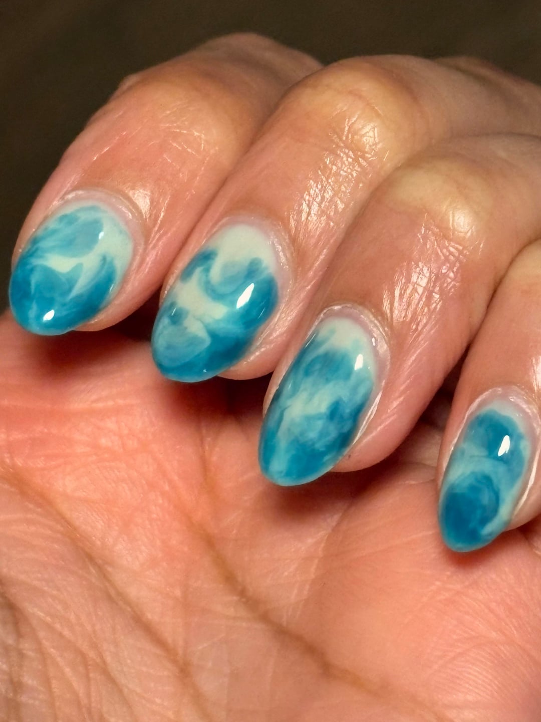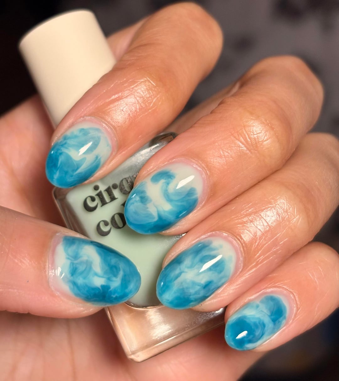 I laid down a kind of base line of the sweet mint, making it thinner at the top, then laid a couple blobs of curaçao throughout, then i took the sweet mint brush, w/ very little polish, and and swirled/pushed it thru those blobs. I did 2 coats of this for each nail.