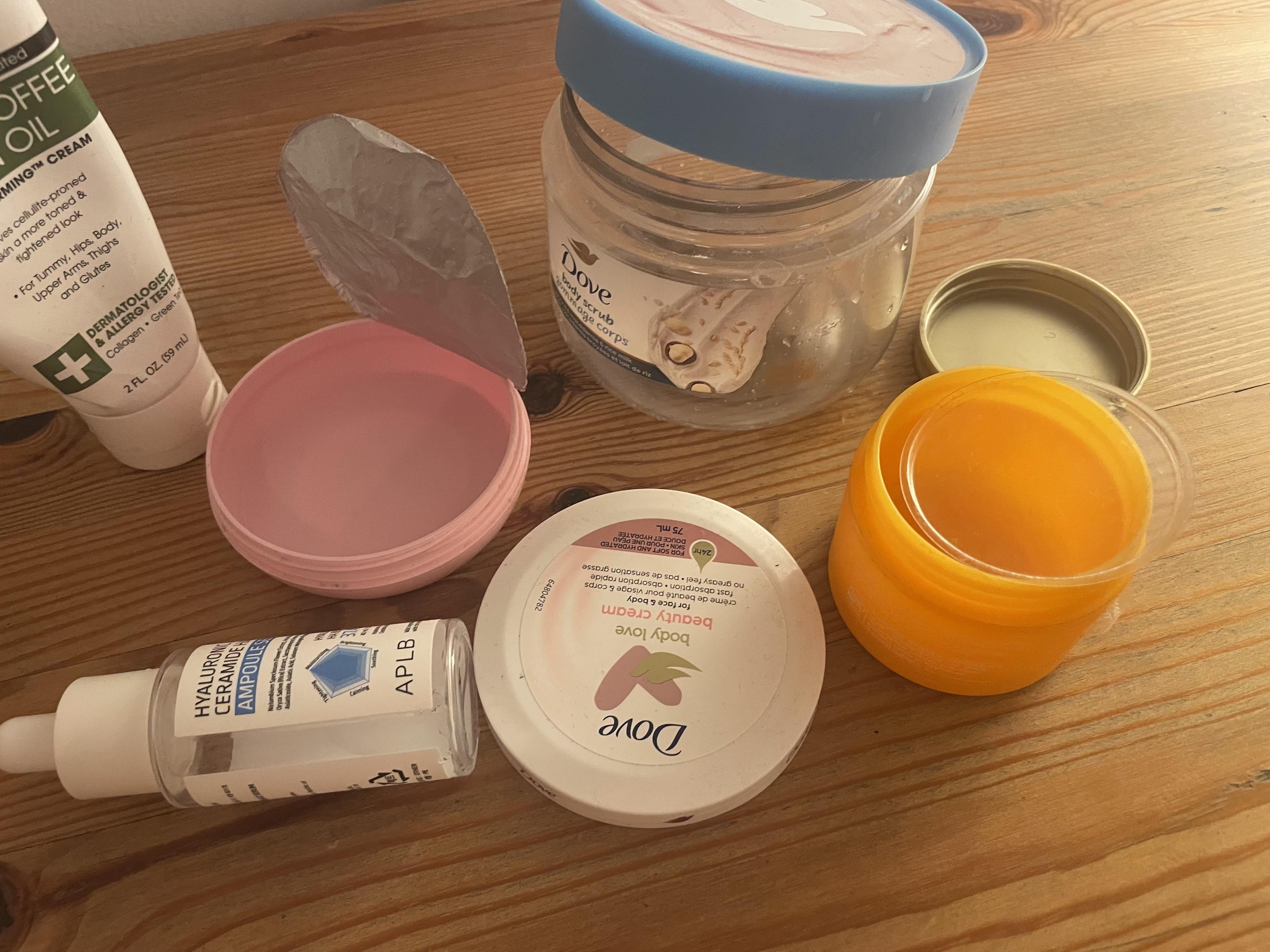 Dove scrub (staple forever), green coffee cream, dove body creame (will repurchase), aplb serum (won’t repurchase), Avalon organic vitamin c riche face cream (was really bad to my face, irritation, too greasy) by deathcabforakitty