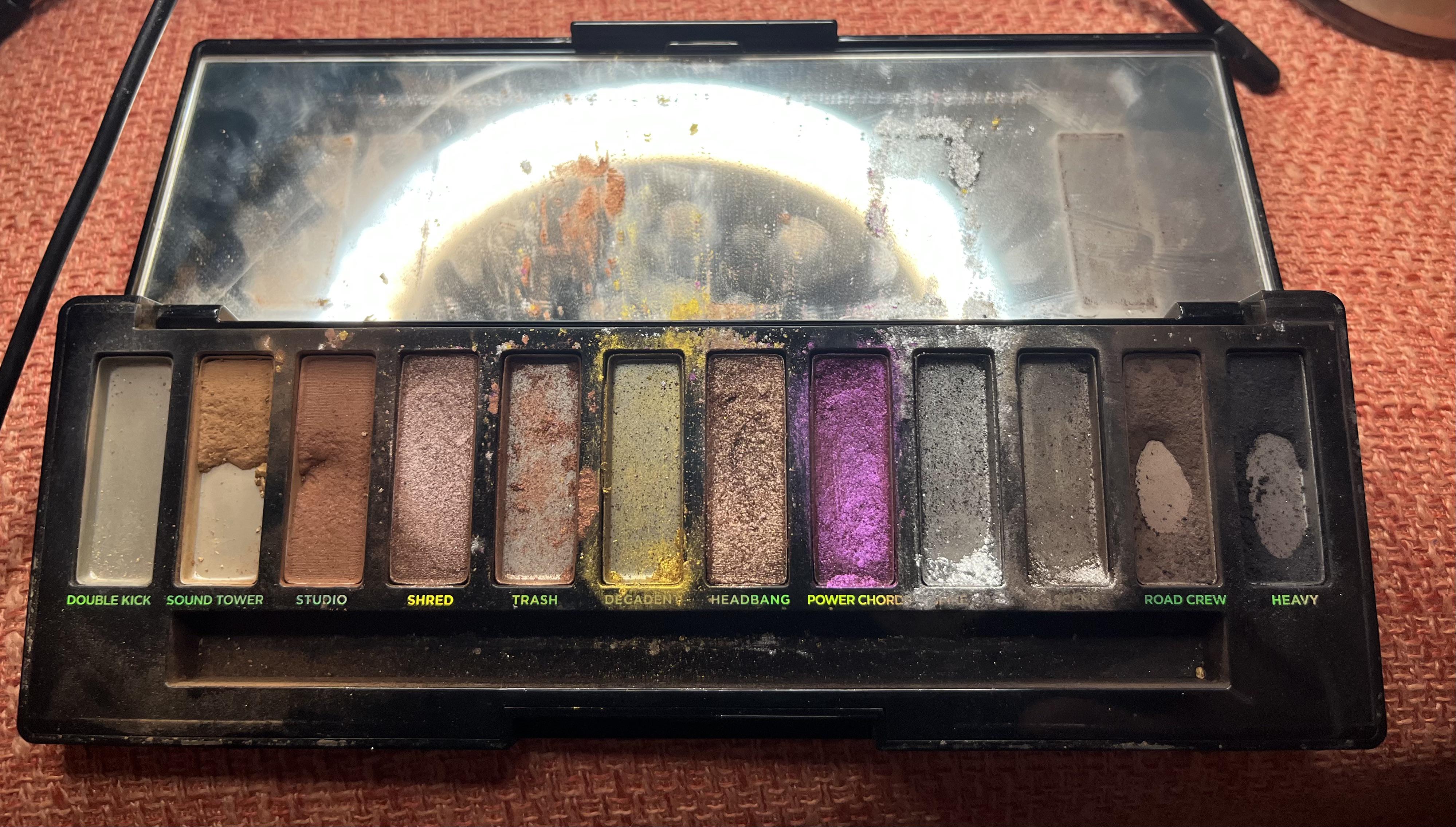 Got this just about exactly two years ago for my birthday. Spiked stud, scene, and decadent would probably be true pans by now but I have similar colors in other UD and colourpop palettes so I kinda go back and forth. Same with studio I have a lot of medium matte browns so I go back and forth. Trash also sadly exploded so that was an accidental pan 🙁 but everything also was not.
