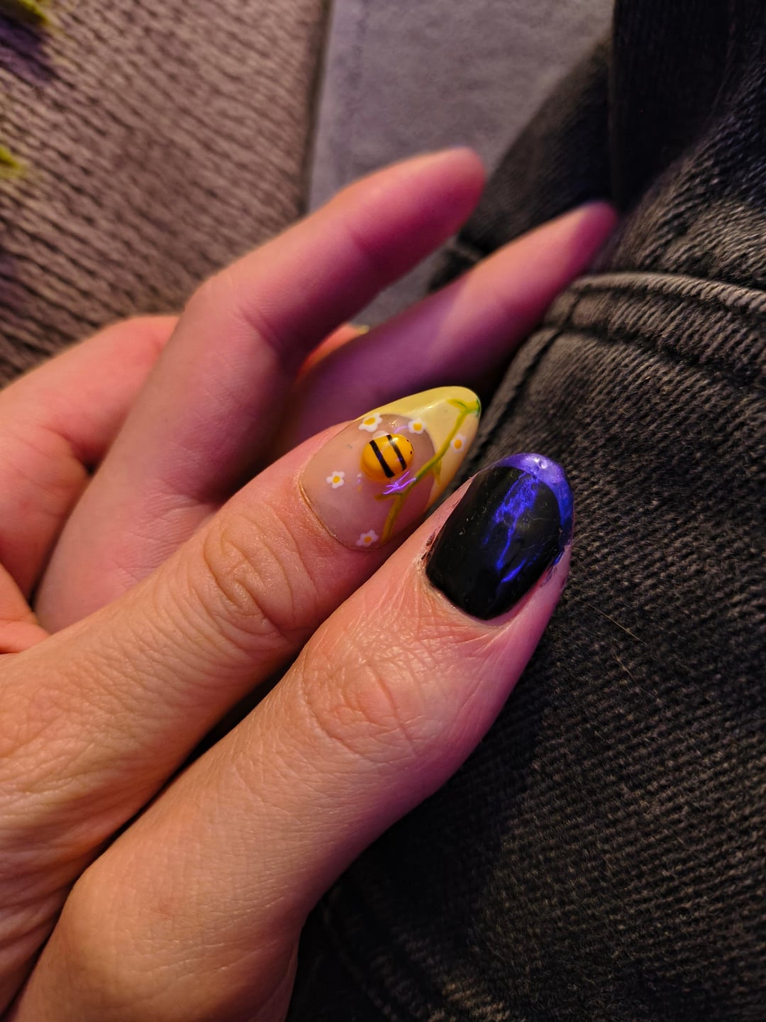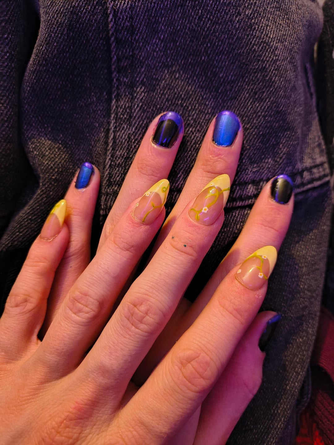 Girlfriend usually goes flat black but let me shake it up a lil for the occasion – my spring frenchies are press ons from a local art fair! For the twist: I'm butch, she's femme 😅 by PhilosoFishy2477