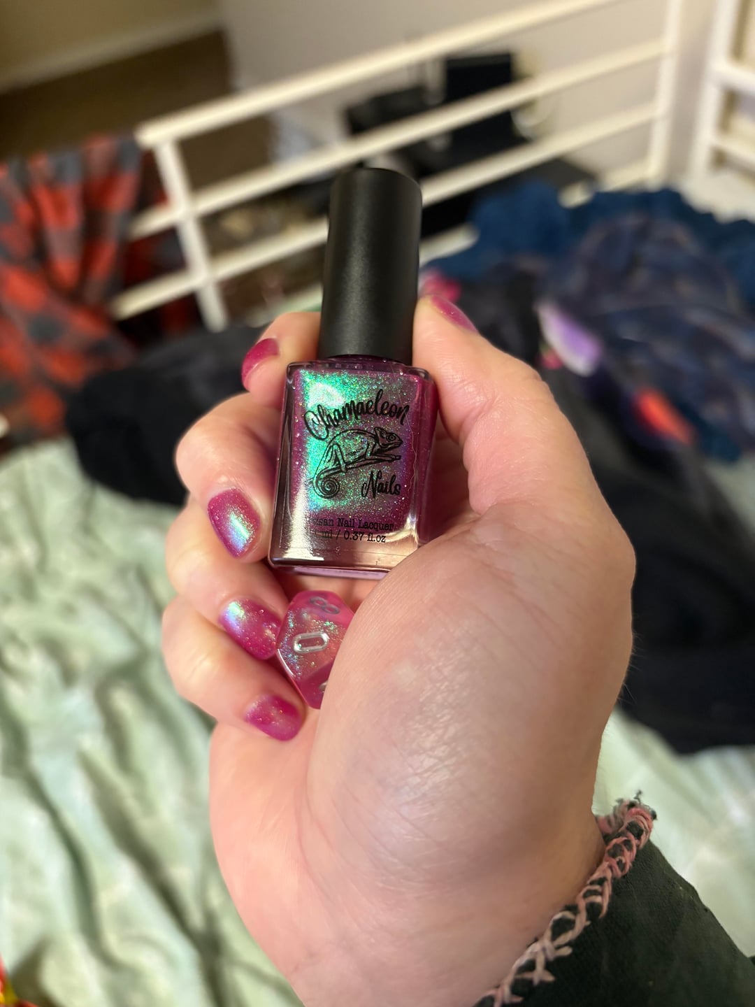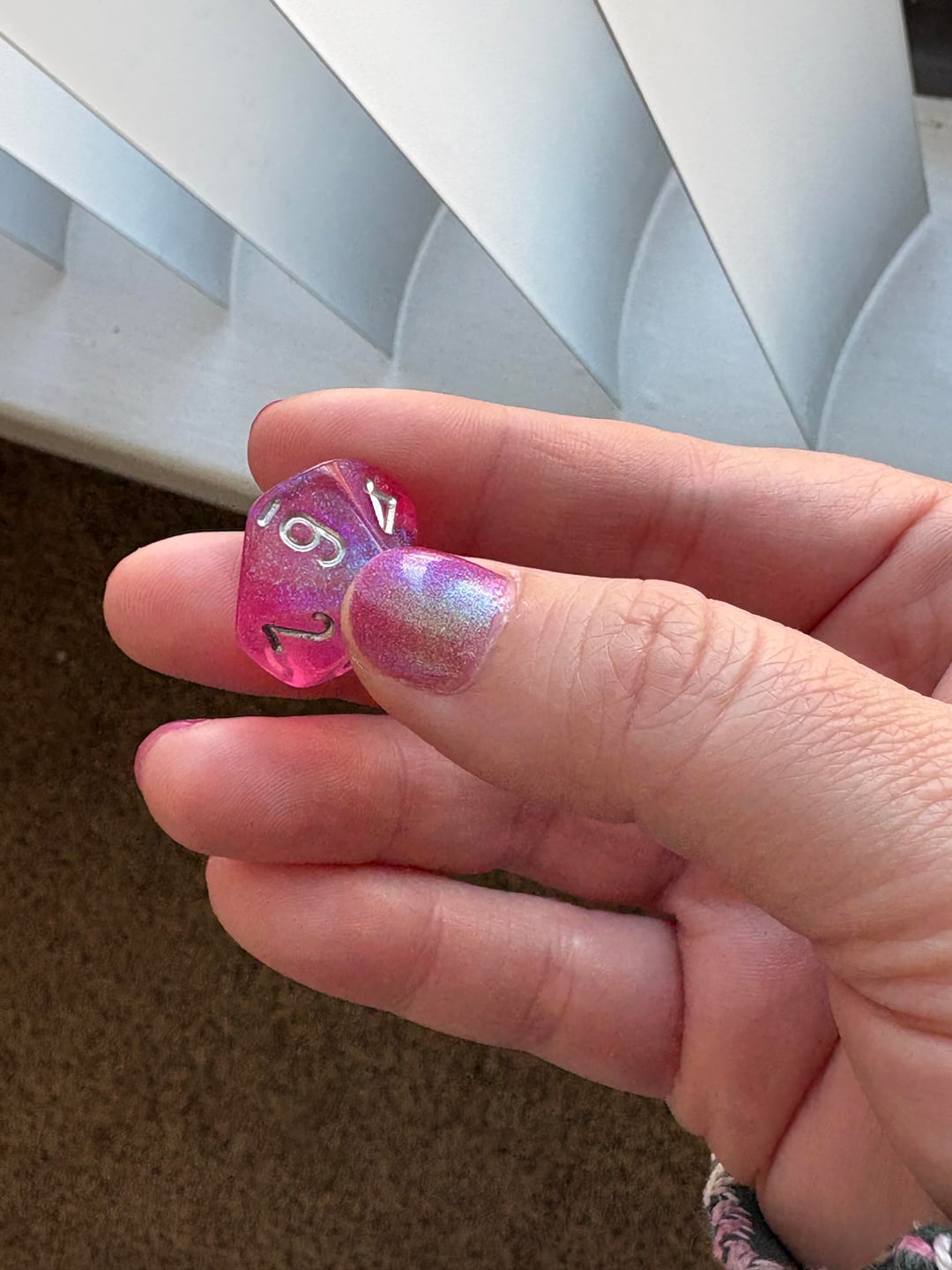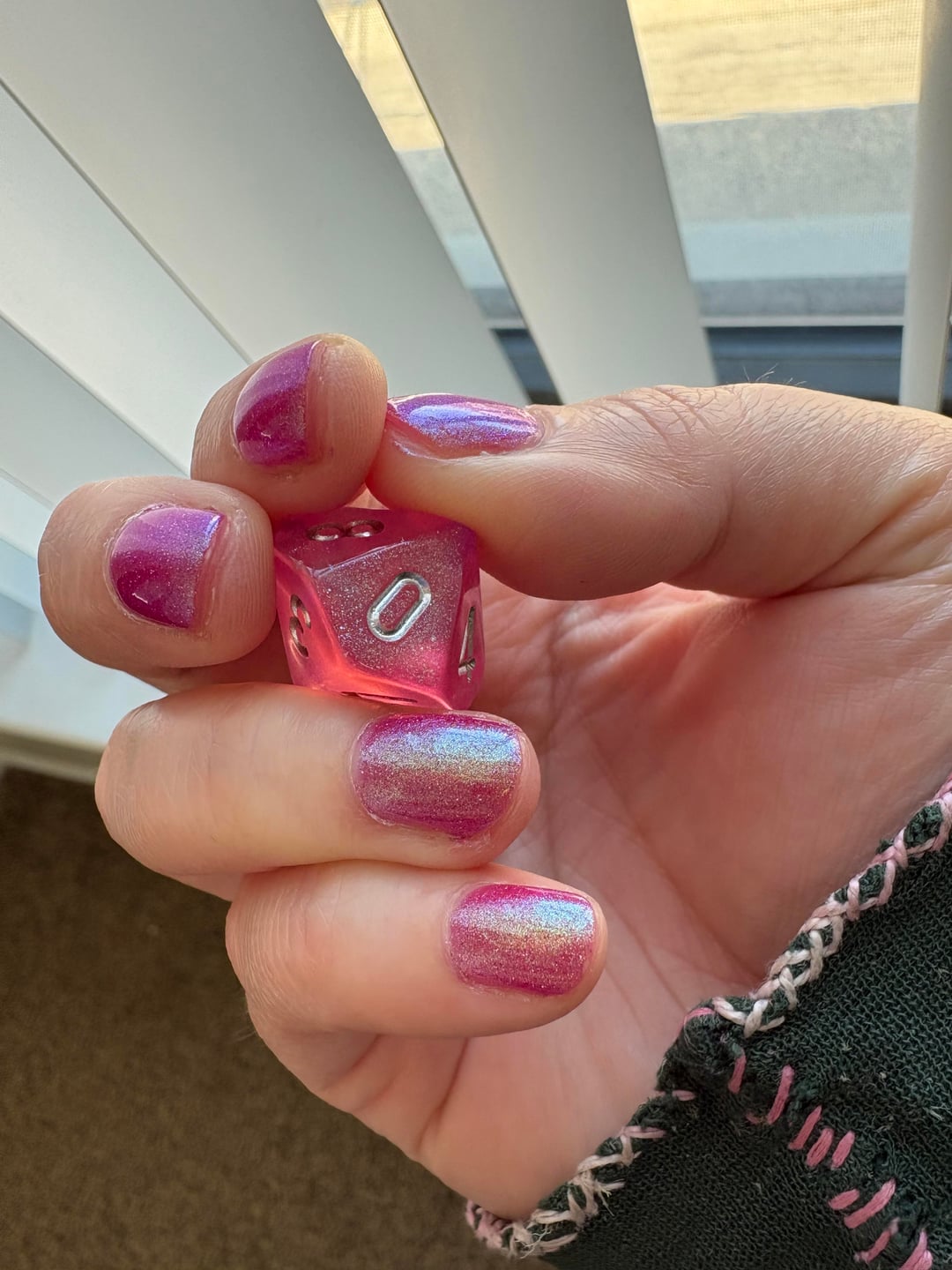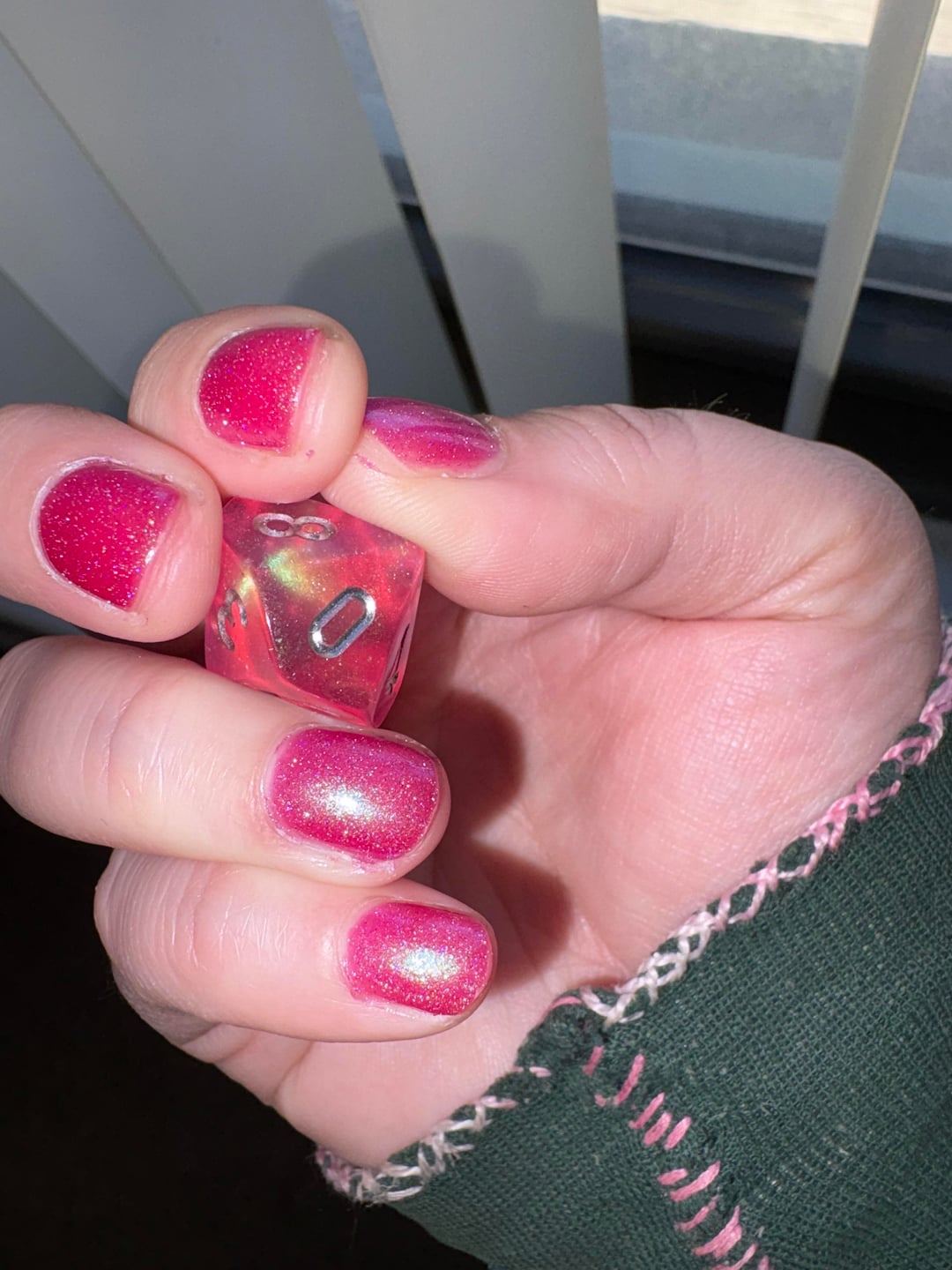 I am a ttrpg nerd and certified dice goblin, and when I saw the Chamaeleon Nails March PPU shade “Whim of the Crystal Dragon” I had to get it because the pictures PERFECTLY matched the Chessex Borealis Pink old glitter dice. After waiting for aaaaages the polish finally arrived and it’s PERFECT. I will absolutely be using this polish next month when I go to the Critical Role live show in a Jester-themed outfit, too!