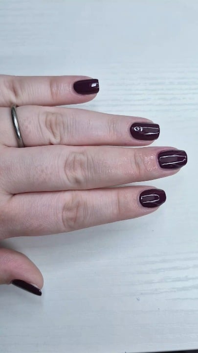 A beautiful plum red. I love how iconic a dark red is, always looks good with anything! Applied very smooth and only took 2 coats.