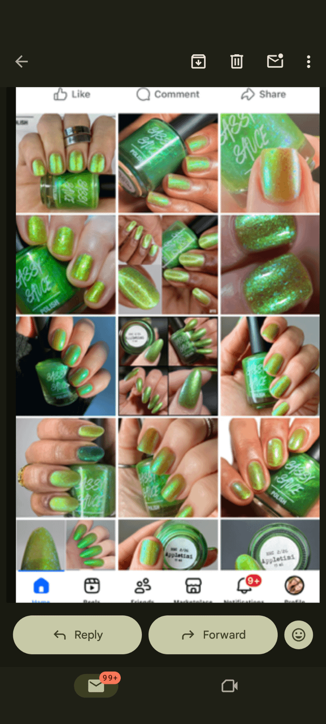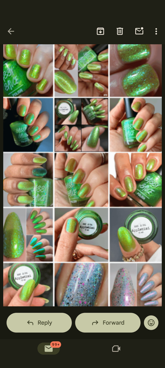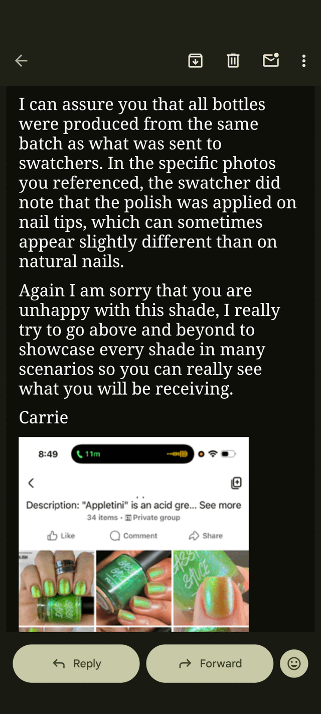 I attached photos of what she said. Is it just me or… Do none of the swatch photos look like what I got still? Like am I crazy? I feel crazy. I still feel like all the swatches show a much brighter shimmer than what I got and way more of a green base.