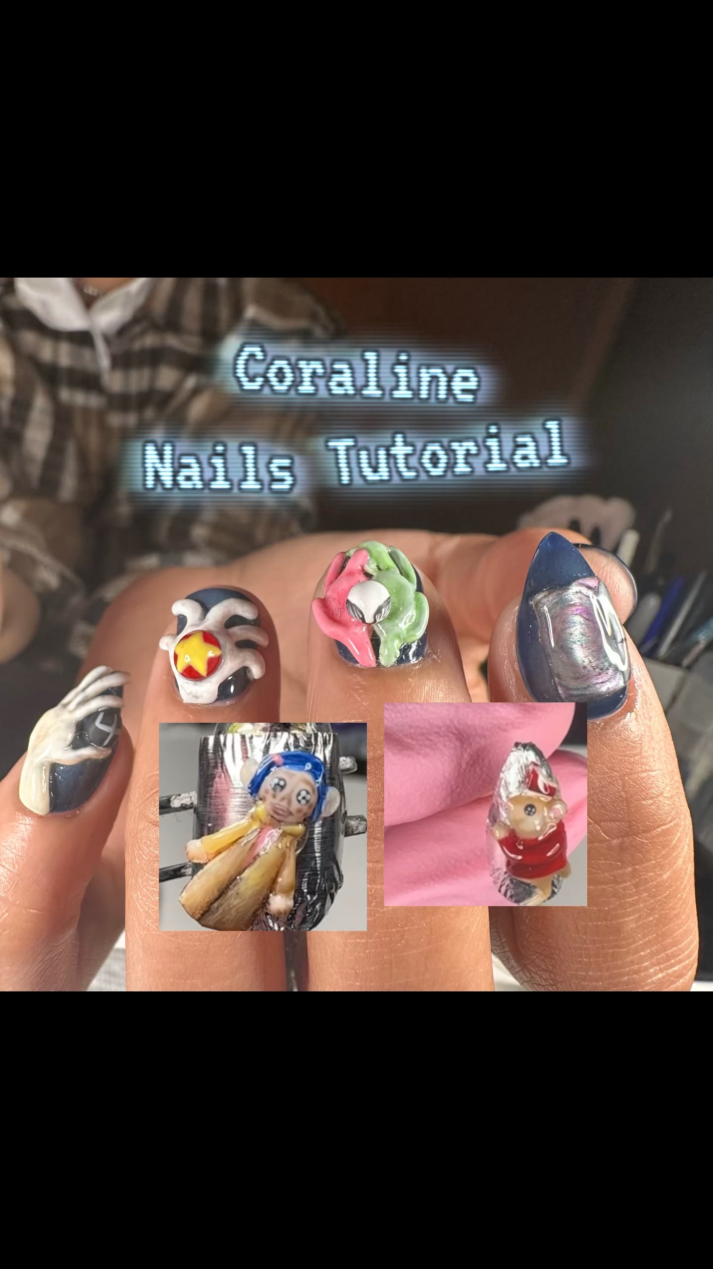 I made this Coraline set last year for Halloween. I never had to make this many intricate charms for a set before so I knew I had to make them pre-appointment. They took hours! I thought it could be a quick tutorial on making 3D nail charms in general. I used clear 3D sculpting gel, but you can also use color ones if you have them to make the process faster.
