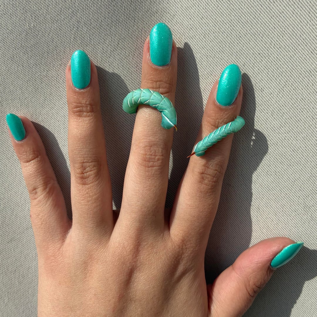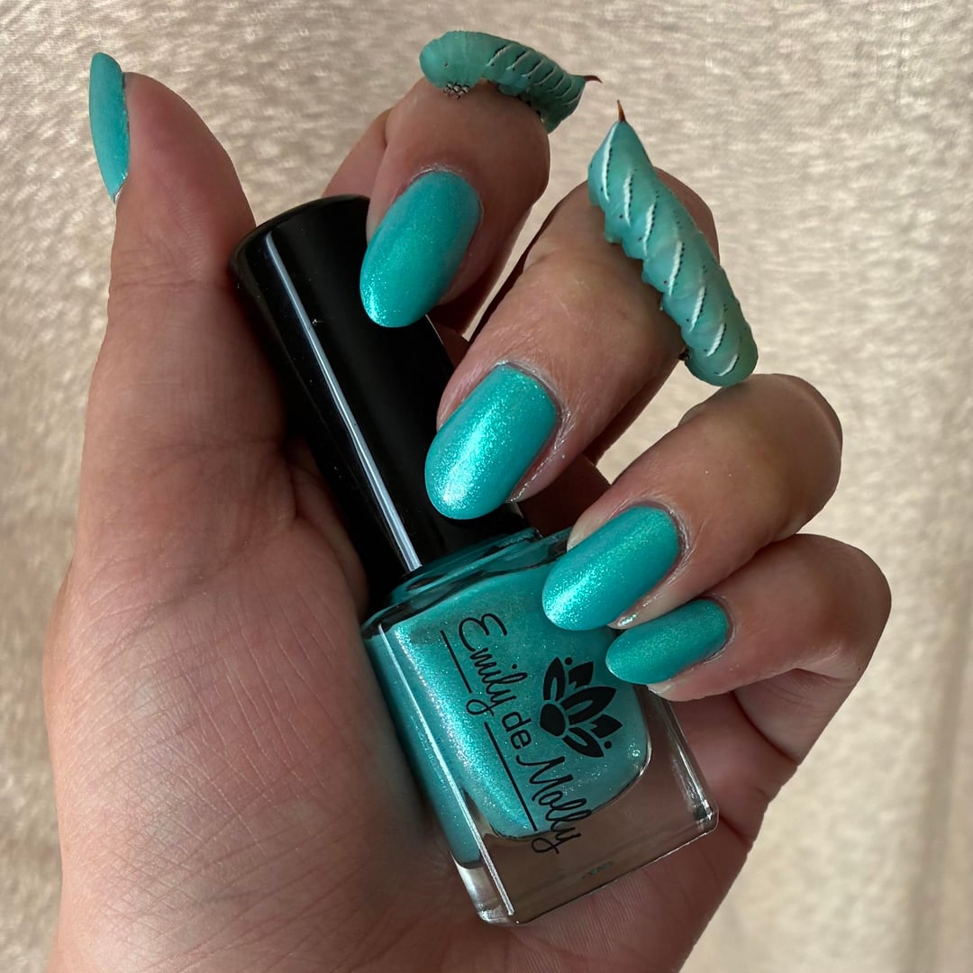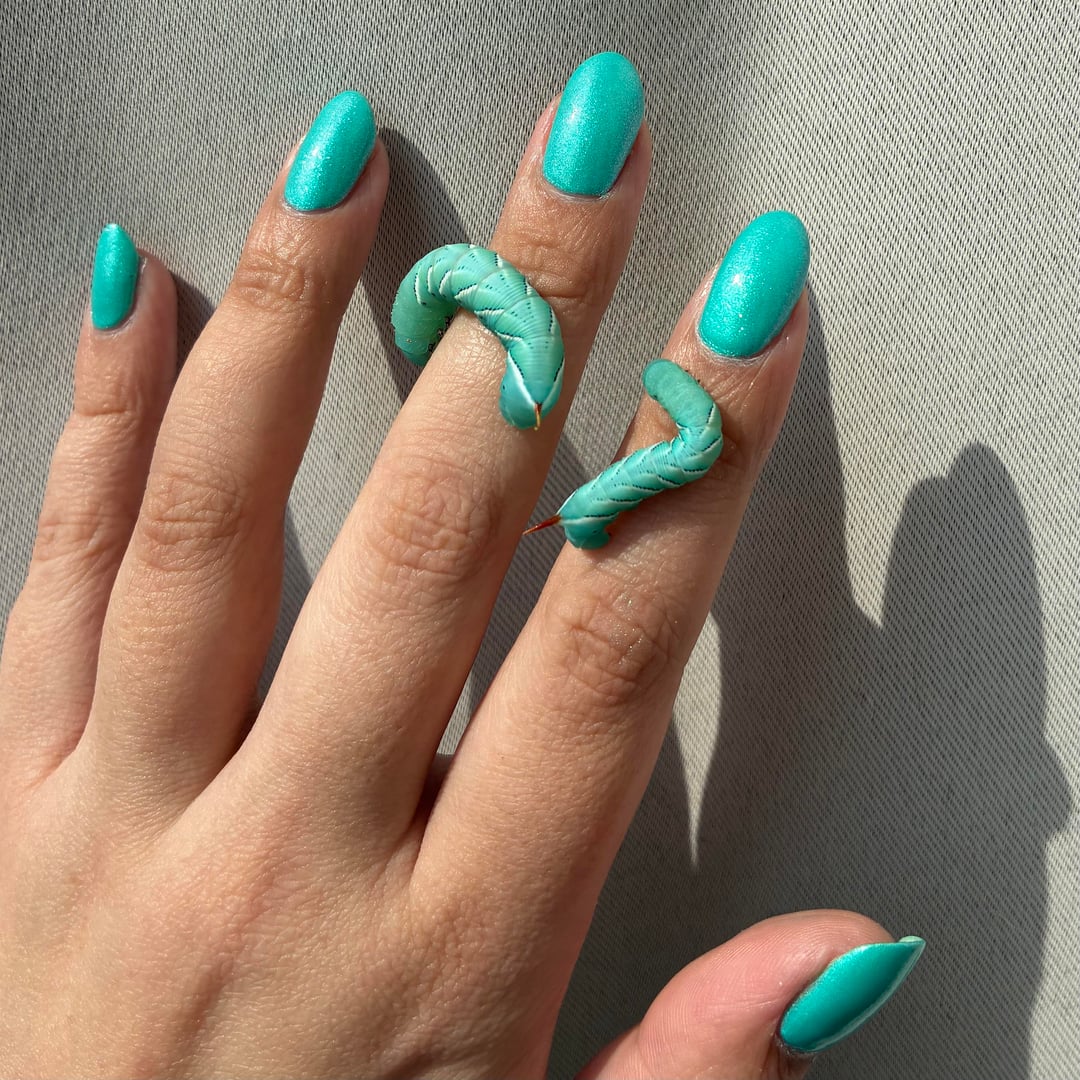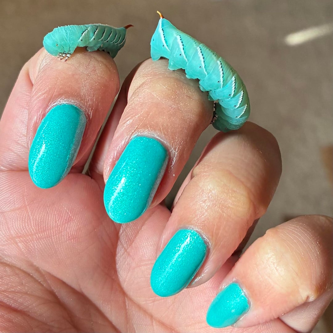 Yessss I used to work on a bug farm and raised hornworms lol (plus crickets, superworms, dubia roaches). I miss the lil guys, they eat so much and get so big and when they pupate, the little tip at their end wiggles around to drill themselves underground 😭 hornworms rock, this mani rocks!!