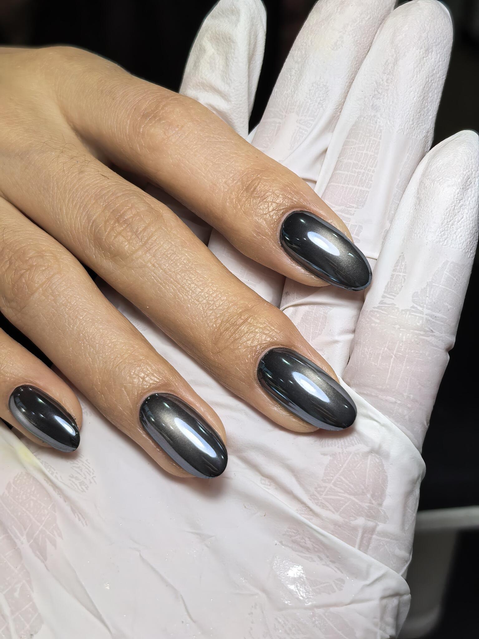 honestly did not think this would work as well as it did lol. layered a black cat eye gel with chrome powder on top and it gave the most insane mirror finish — kind of reminds me of a black pearl? like dark but still catches the light in every direction