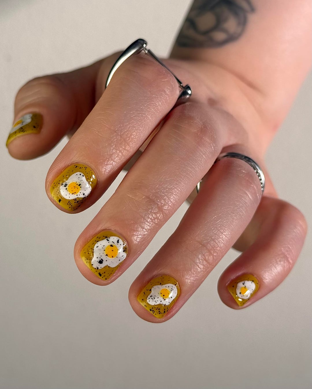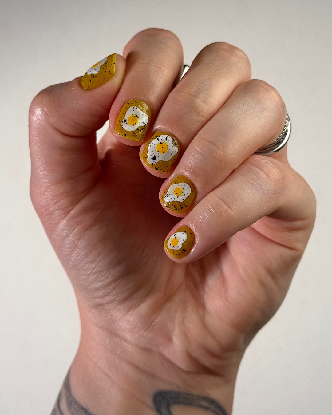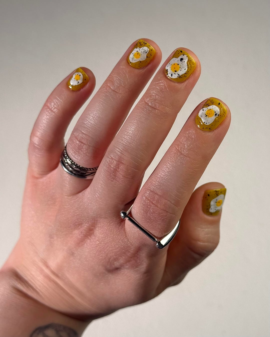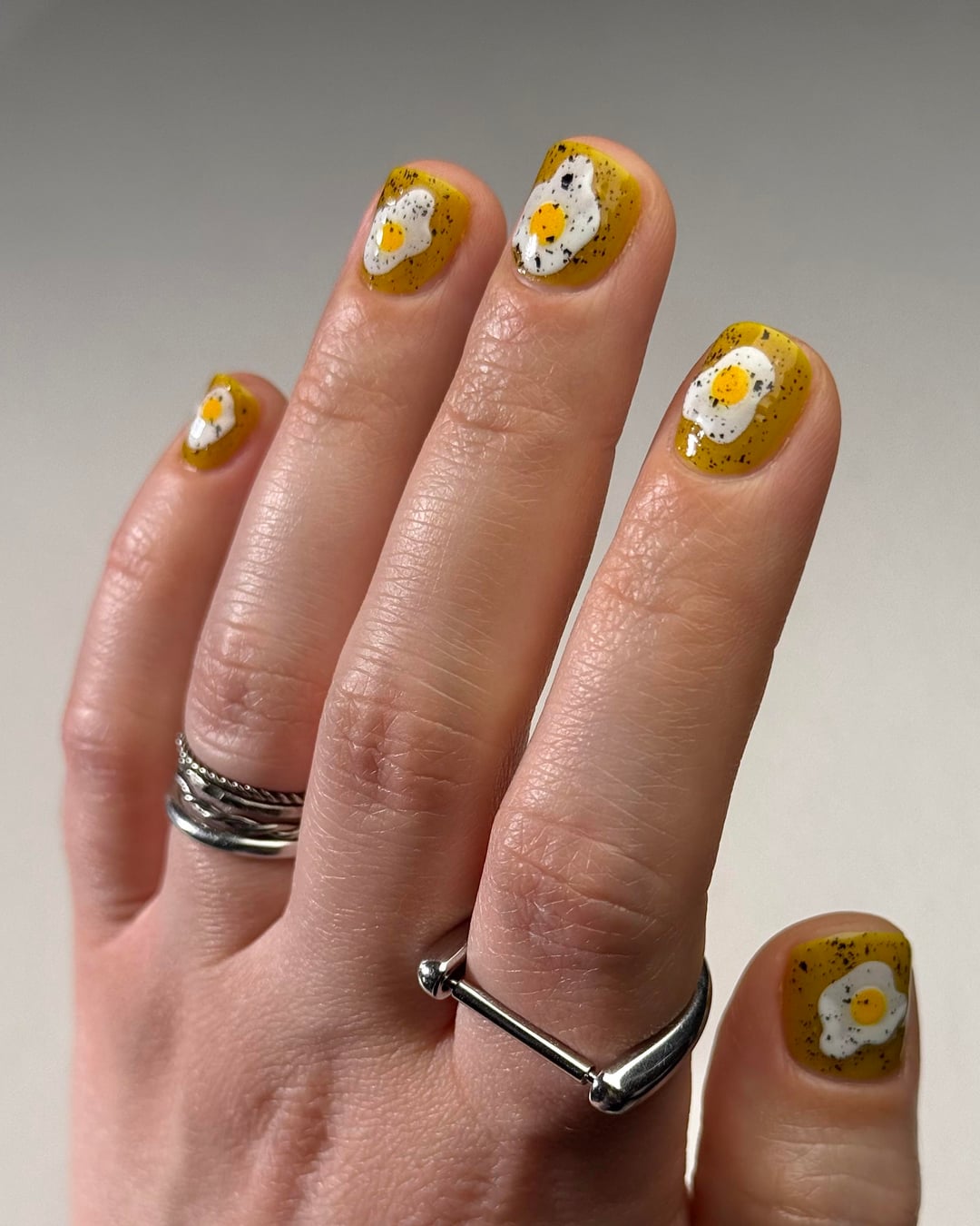 Cracked Polish – That’s All Yolks (three coats), topped with Mascara Flakes (one coat)