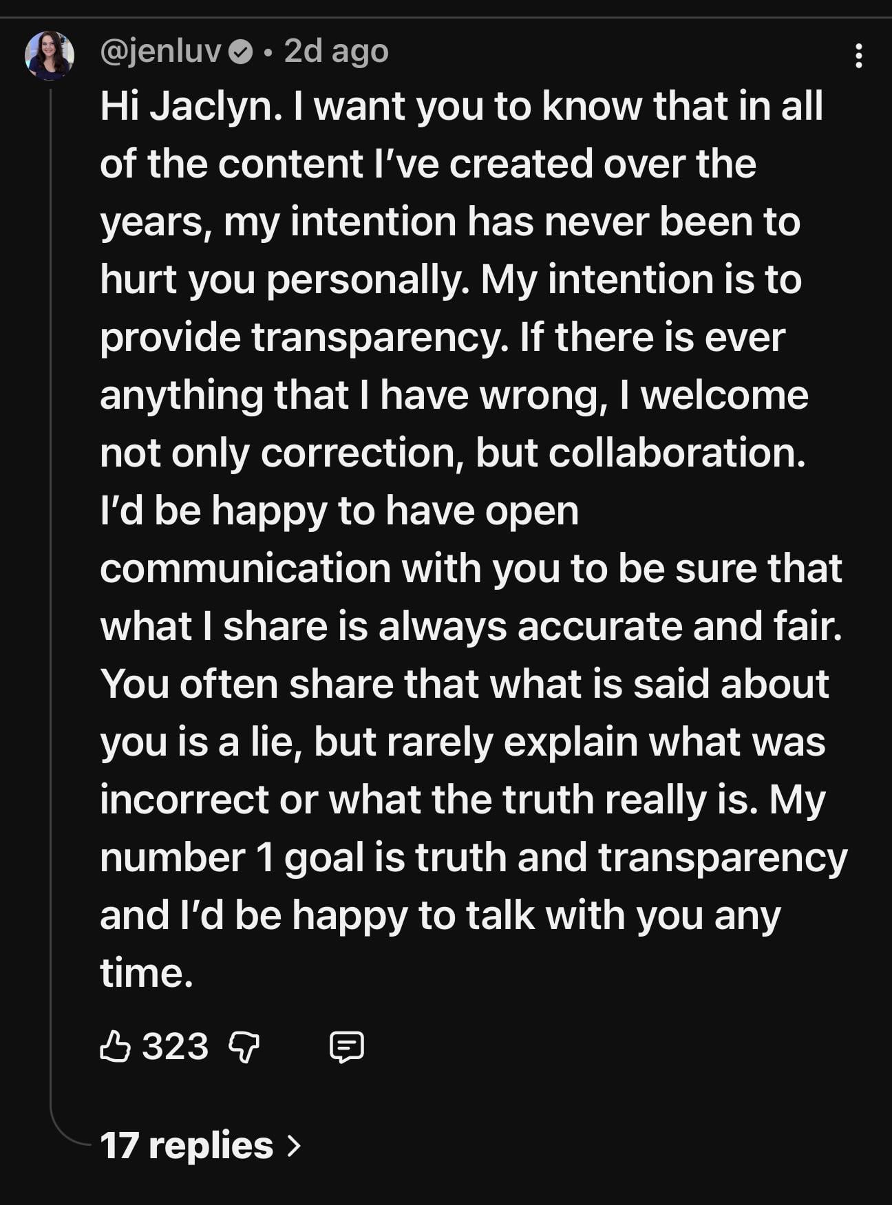 Jaclyn basically called Jen out. It’s pretty normal to respond when that happens. Plus Jen already made a statement about this, maybe include the context? Droves of Jaclyn supporters started brigading her recent video