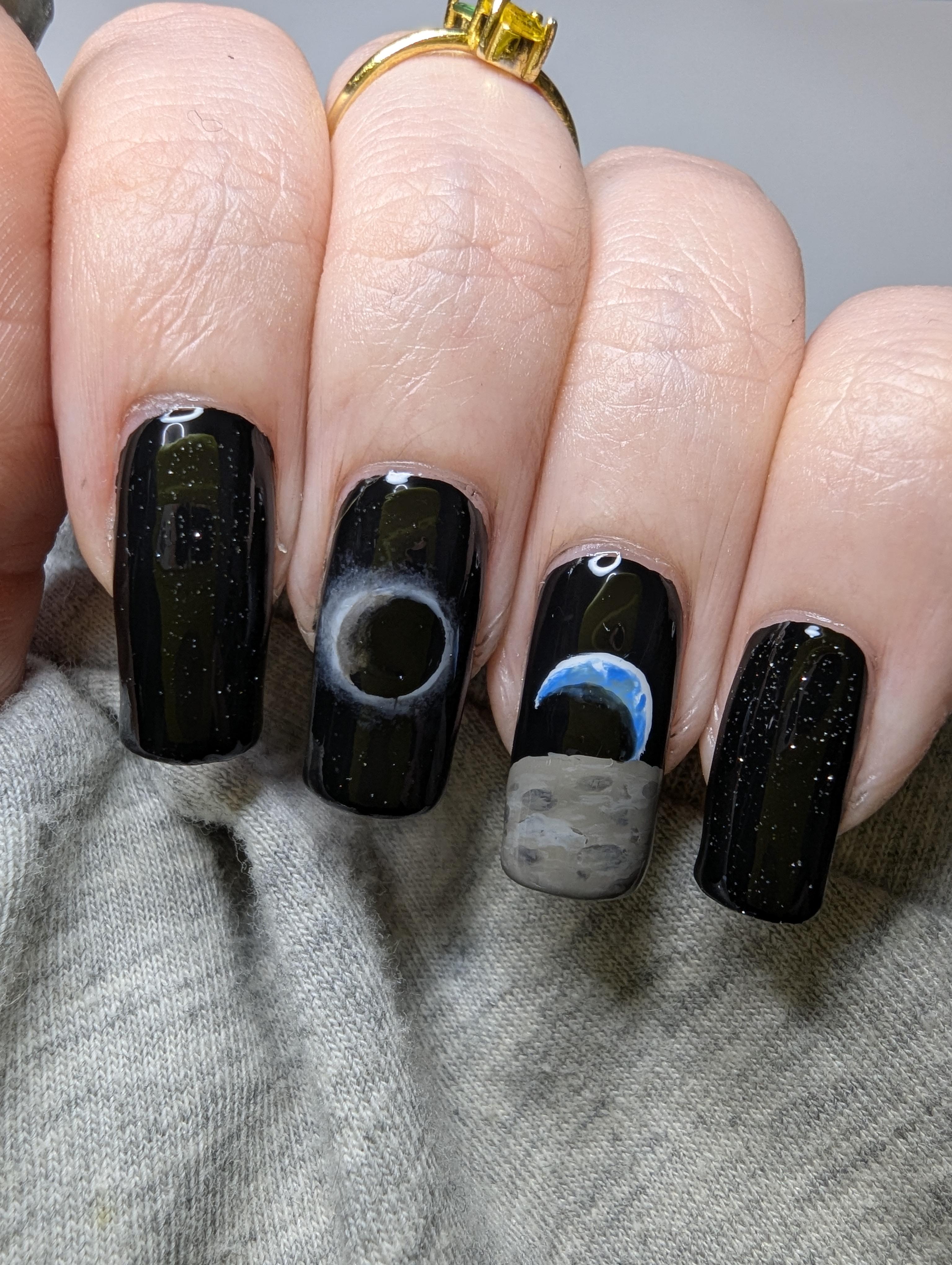 Linry on April 11, 2026 1:59 pm Products used: Top Coat: Seche Vite Base coat : Home made peel off base, seche clear Holotaco: one coat black, foreshadow, duct tape grey zoya: bevin, dory Starrily: imortal jelly, ghost jelly ILNP: canvas essie: ink jelly china glaze: IRL sparkle