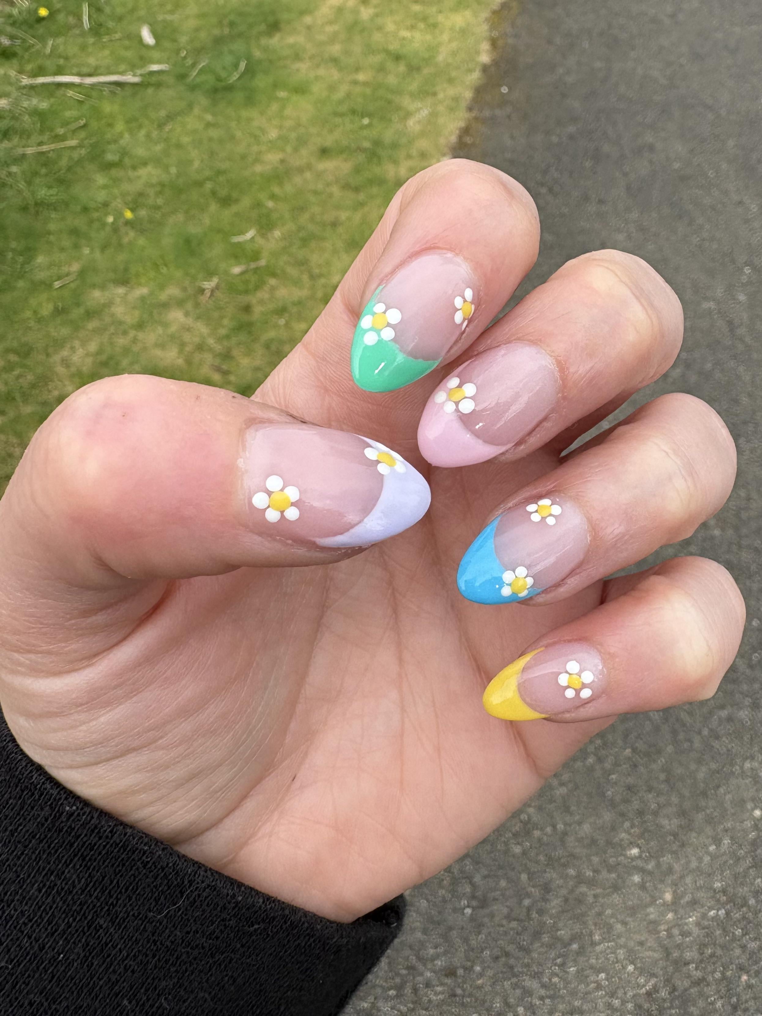 32F, never had acrylics before and decided to treat myself. Something simple and springy to start, but I want to start getting them done regularly to help with dermatillomania problems. I’m super happy with them 🥰 by Far_Calligrapher8252