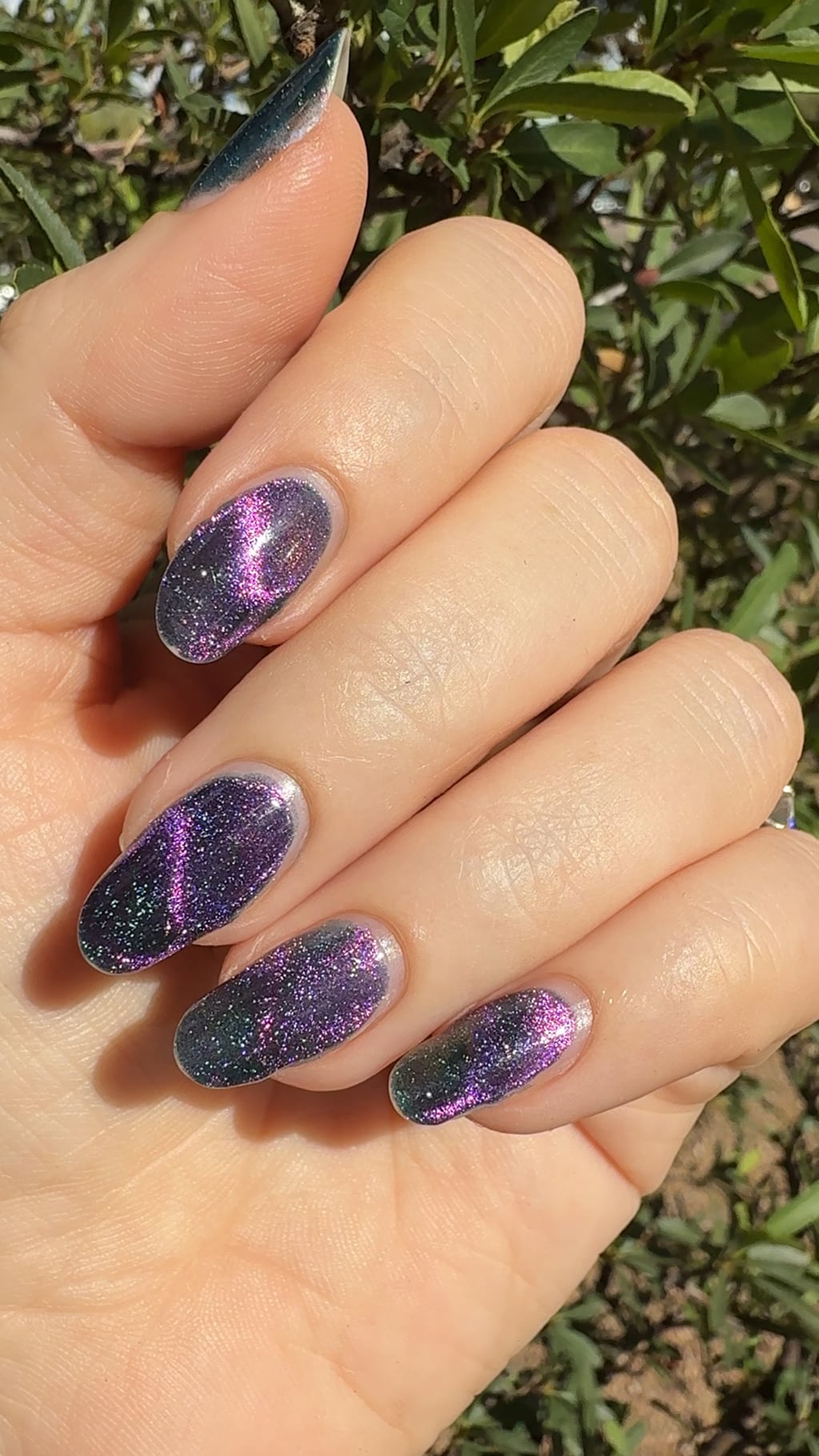 I had to paint my nails for the occasion and chose I Exaggerate Absolutely Nothing Ever by Bees Knees Lacquer. The depth of color in this shimmery magnetic is unreal! I created a cat eye/velvet style using a horseshoe and bar magnet combination. The final result makes me think of the Petrova Line…