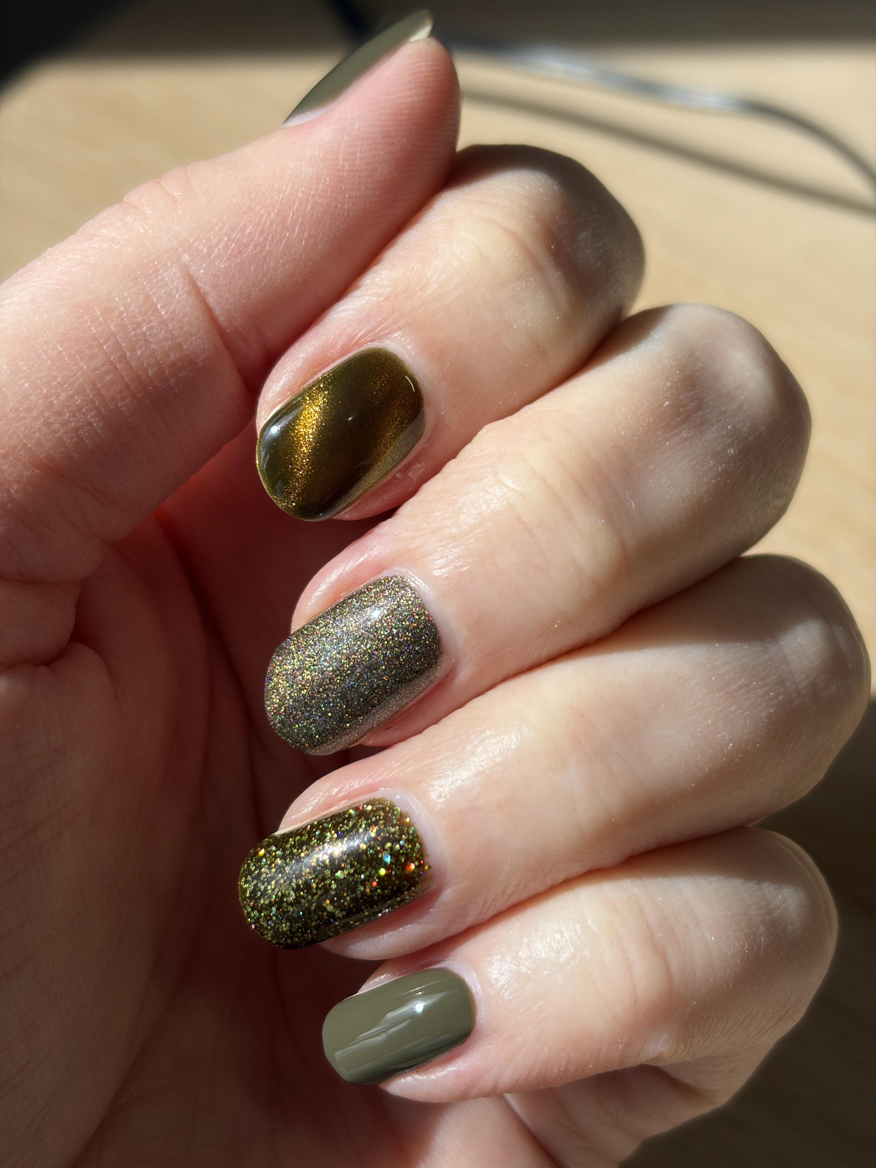 Nailtiques formula 2, KBShimmer Stay Put Hydrating base coat,, Holo Taco ‘Born Ugly’ (thumb & little finger), Holo Taco ‘No Smoking’ (index finger), Holo Taco ‘Dirty Martini’ (middle finger), Holo Taco ‘Sparkly sh*t’ (ring finger), Cuticula Limitless QDTC