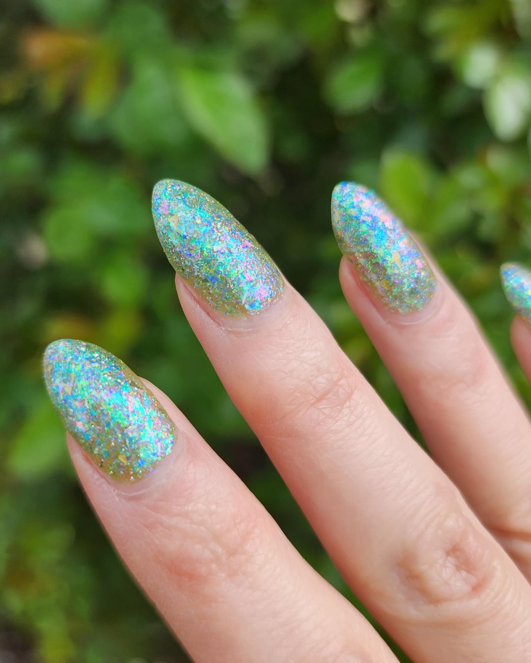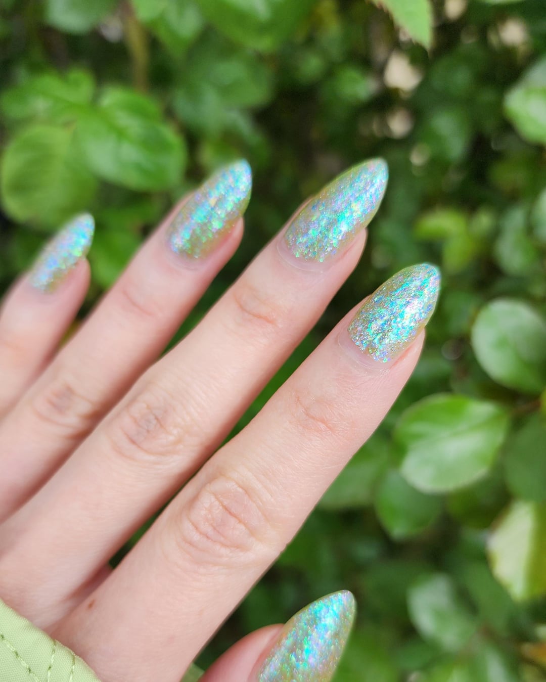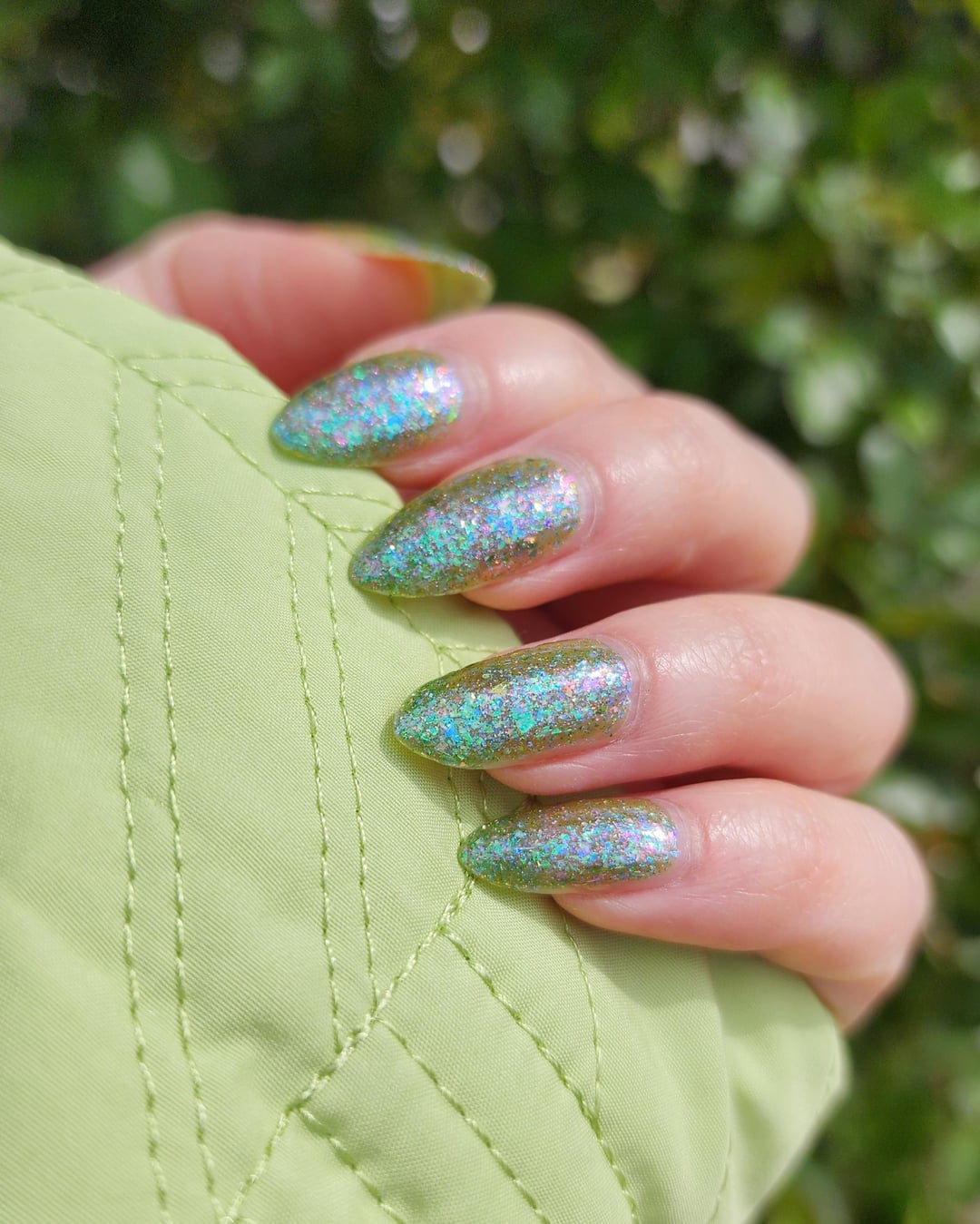 Personally, I prefer a thinner and lighter application of the polish since I like the translucence of flakies with the green-yellow base showing through. You can sort of see the difference in the picture 1 (thinner) vs. 4 (thicker), and in the flash photos.