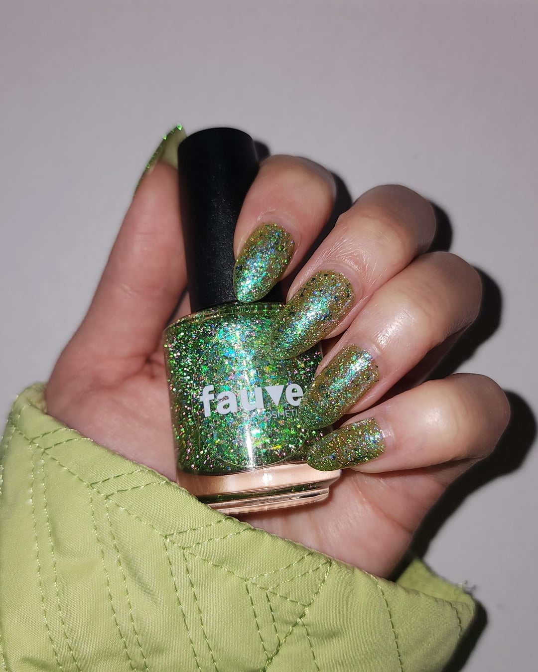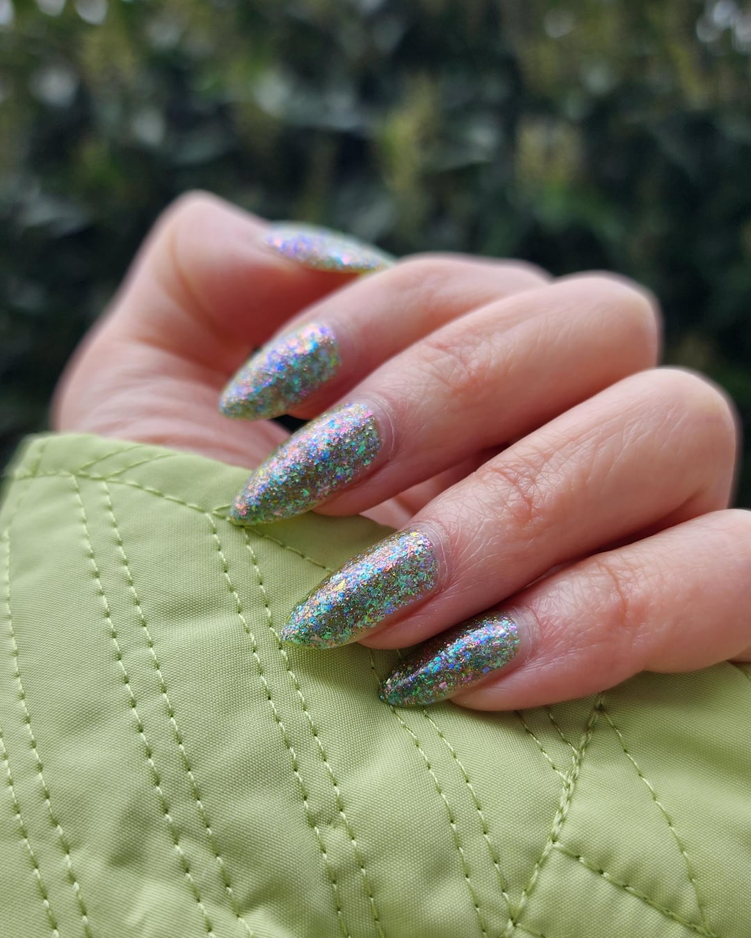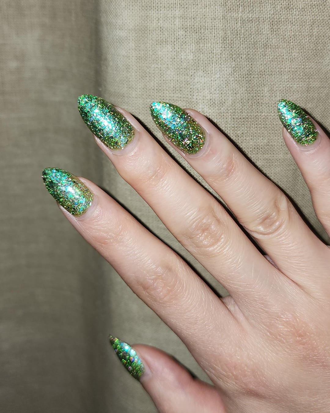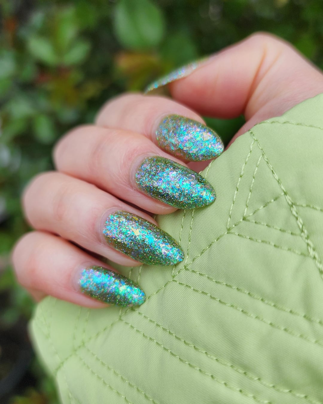 Personally, I prefer a thinner and lighter application of the polish since I like the translucence of flakies with the green-yellow base showing through. You can sort of see the difference in the picture 1 (thinner) vs. 4 (thicker), and in the flash photos.