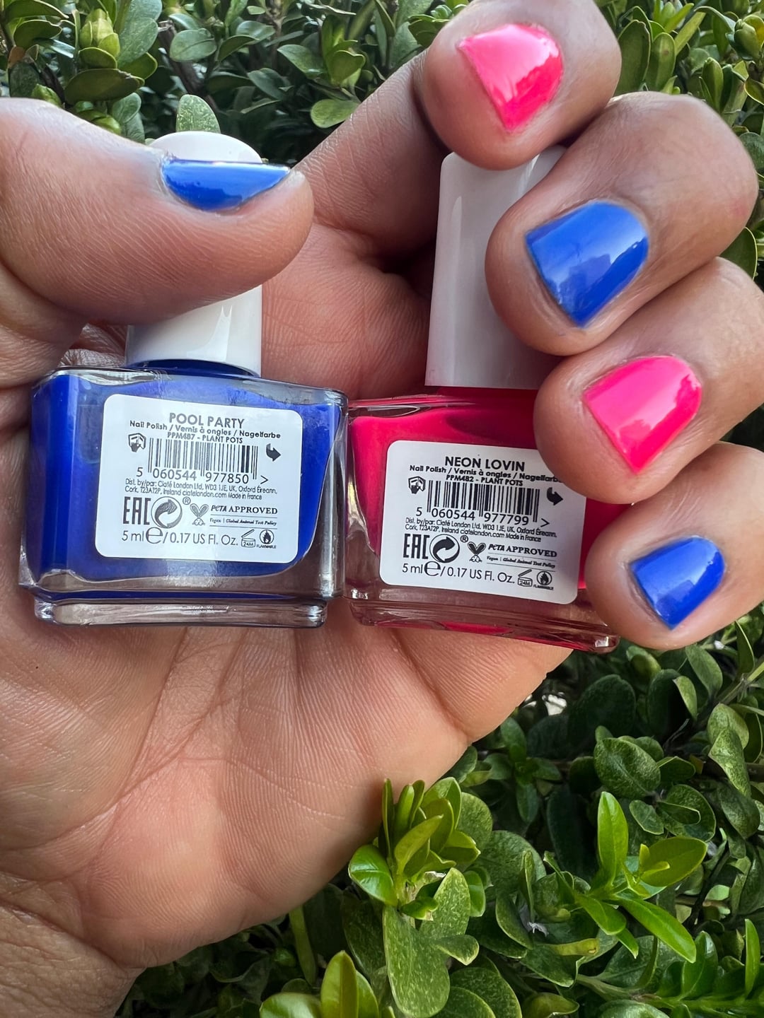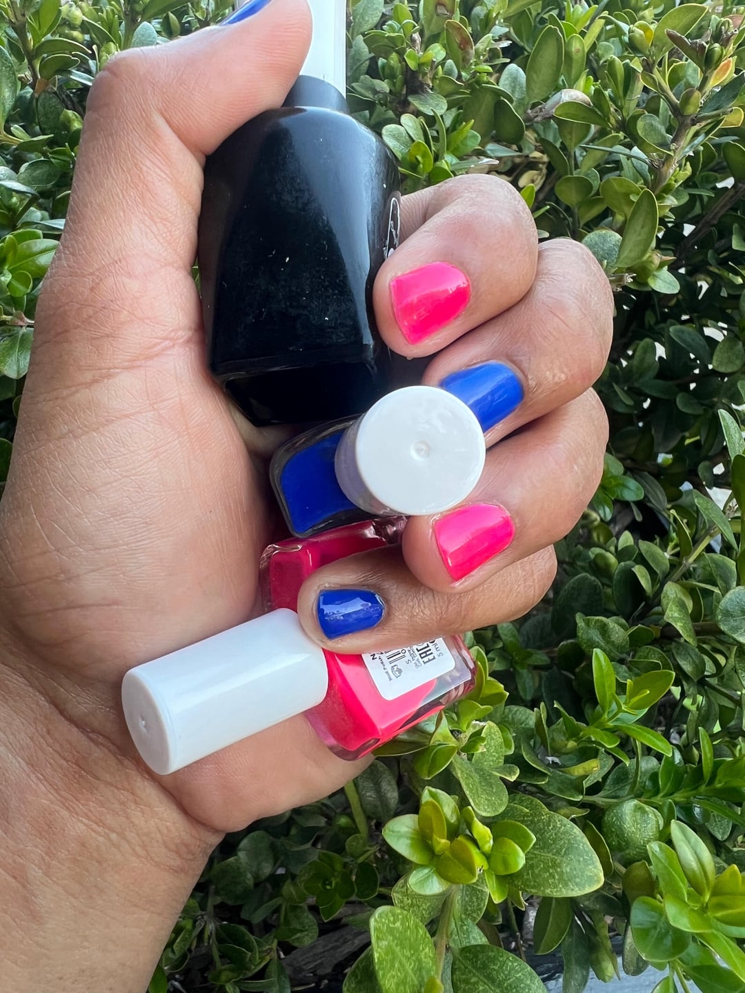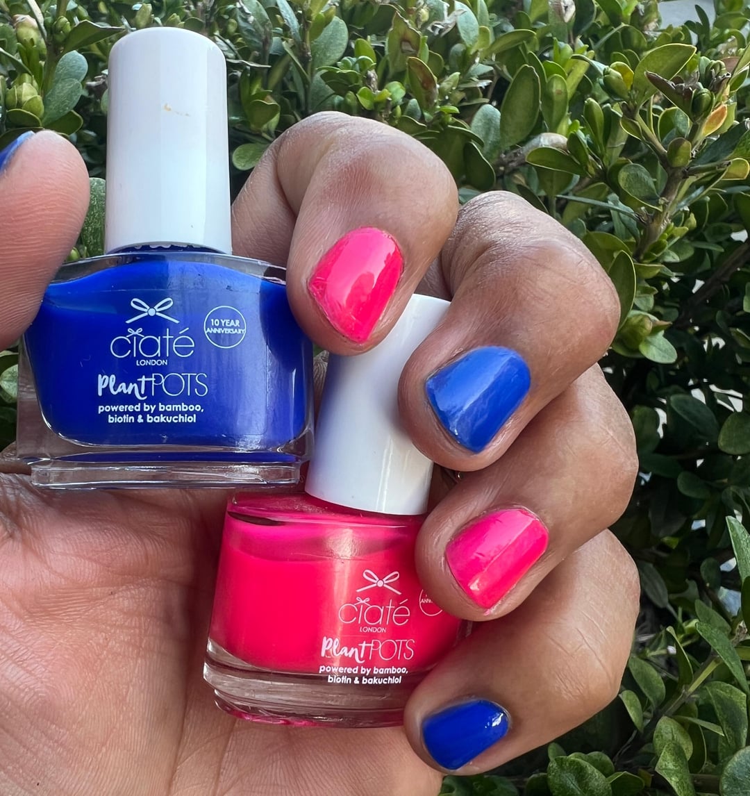 Ciaté Pool Party blue crelly and Neon Lovin hot pink matte (shown here in two coats and topped with Sally Hansen Miracle G top coat). These are two that I kept from a 2022 Advent Calendar. Lovely for Summer! I like these mini bottles, and even though the brush is short, it paints well (paddle shape, flexible bristles). I like the way these slim, curved bottles stack together, large or small.