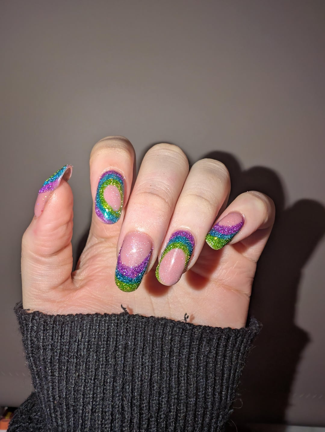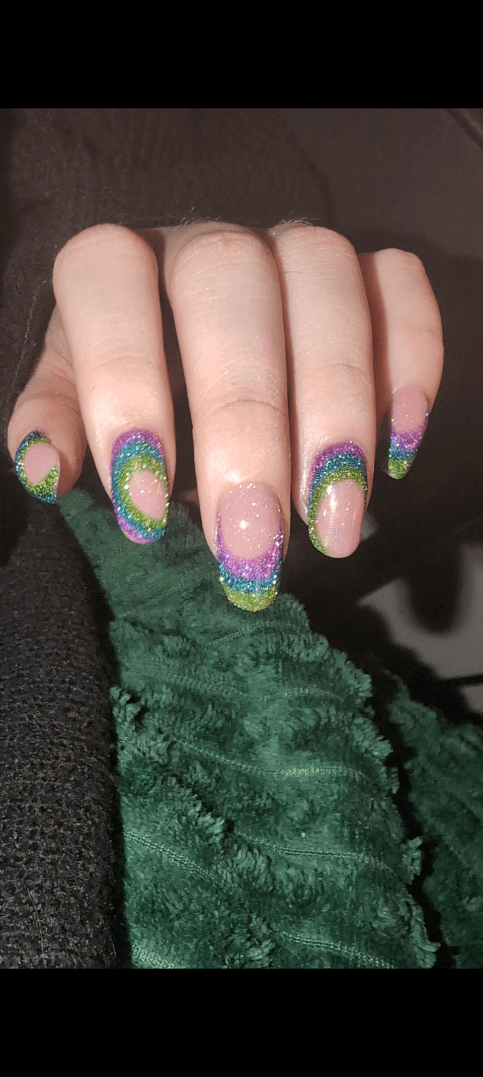 Lacquers : Sheer tint illusion emilydemolly, ultra-violet, tidal spark, in the lime light, all glitters from Cosmic polish and their scattered holo topper, scattered starlight.