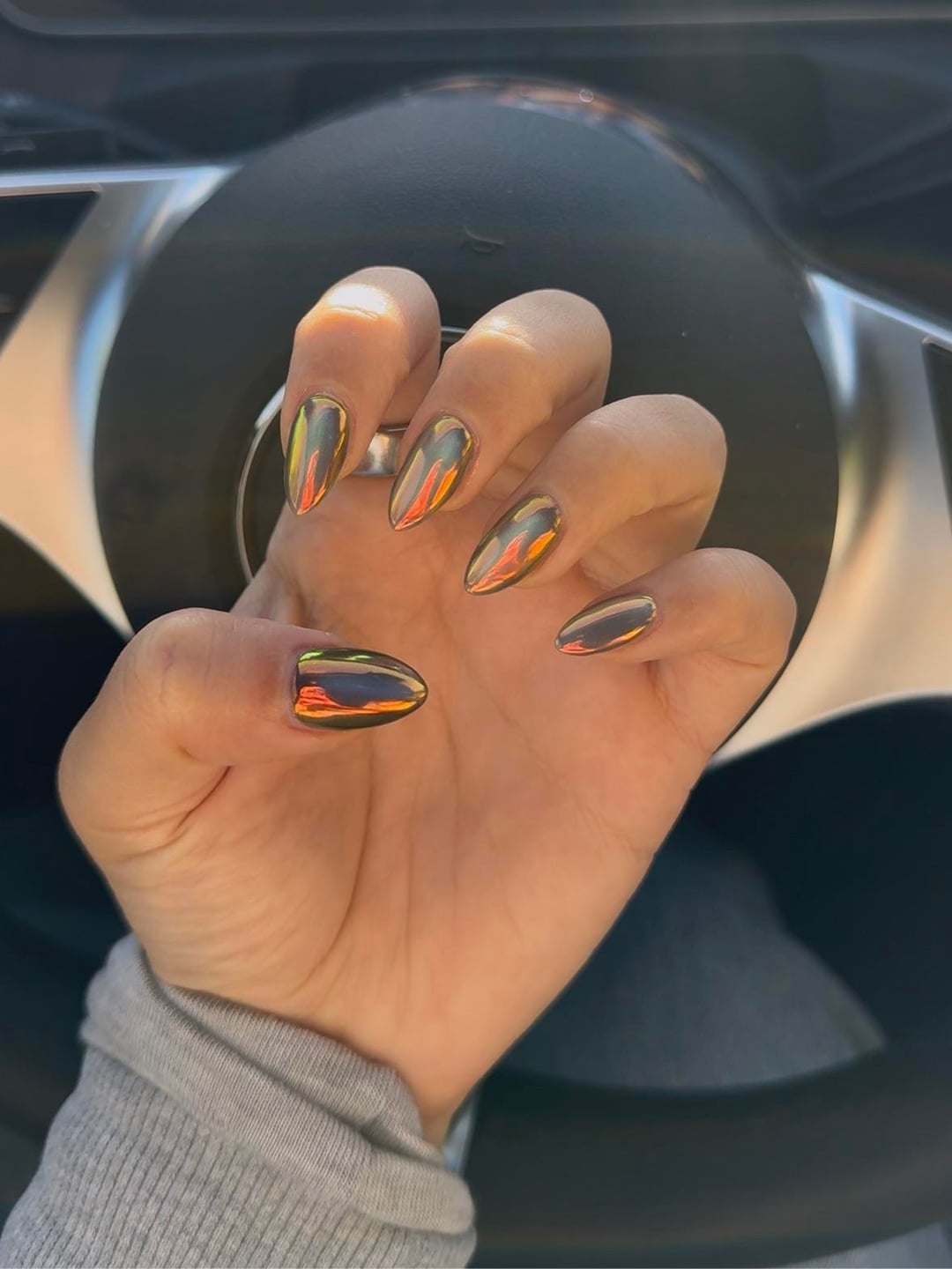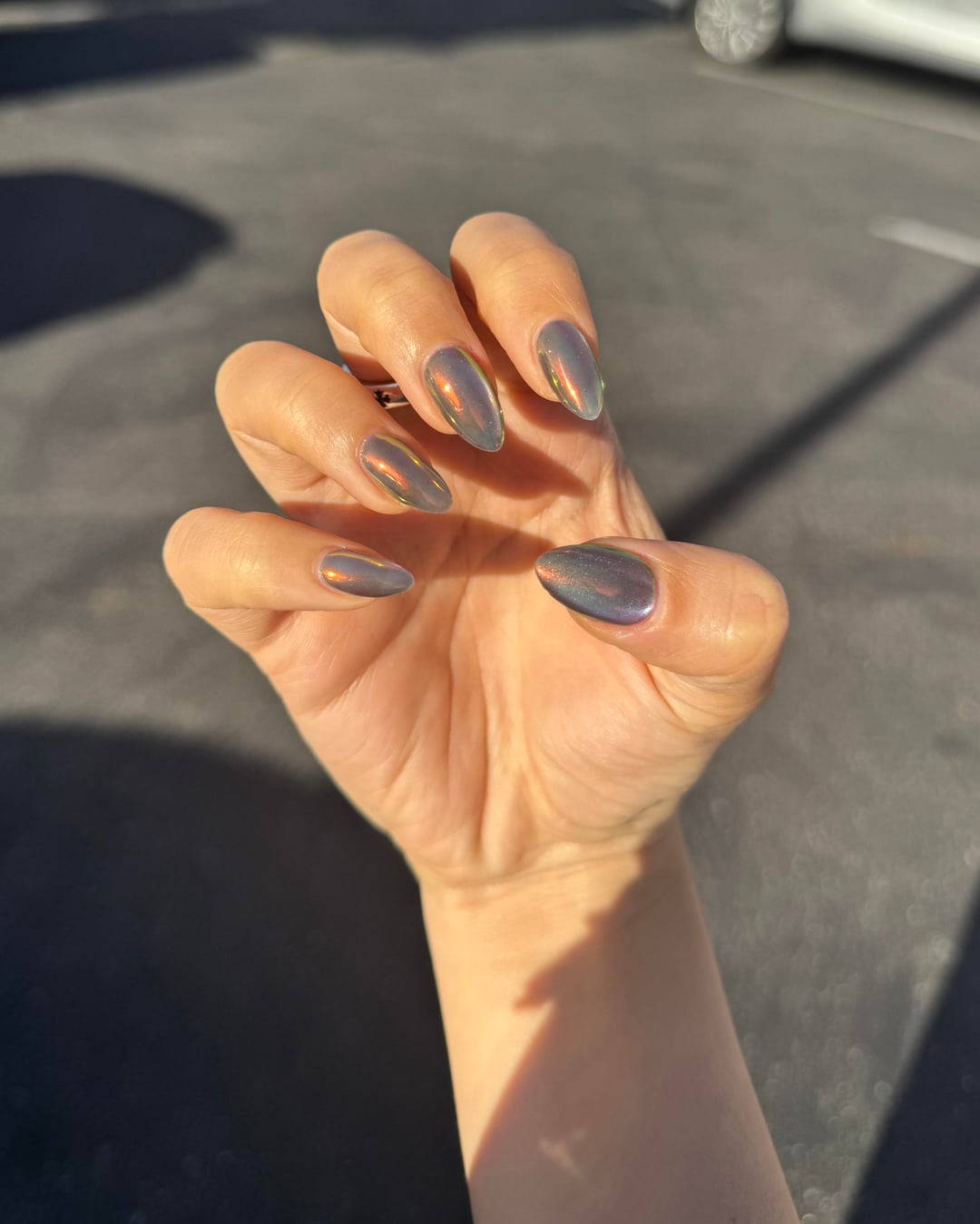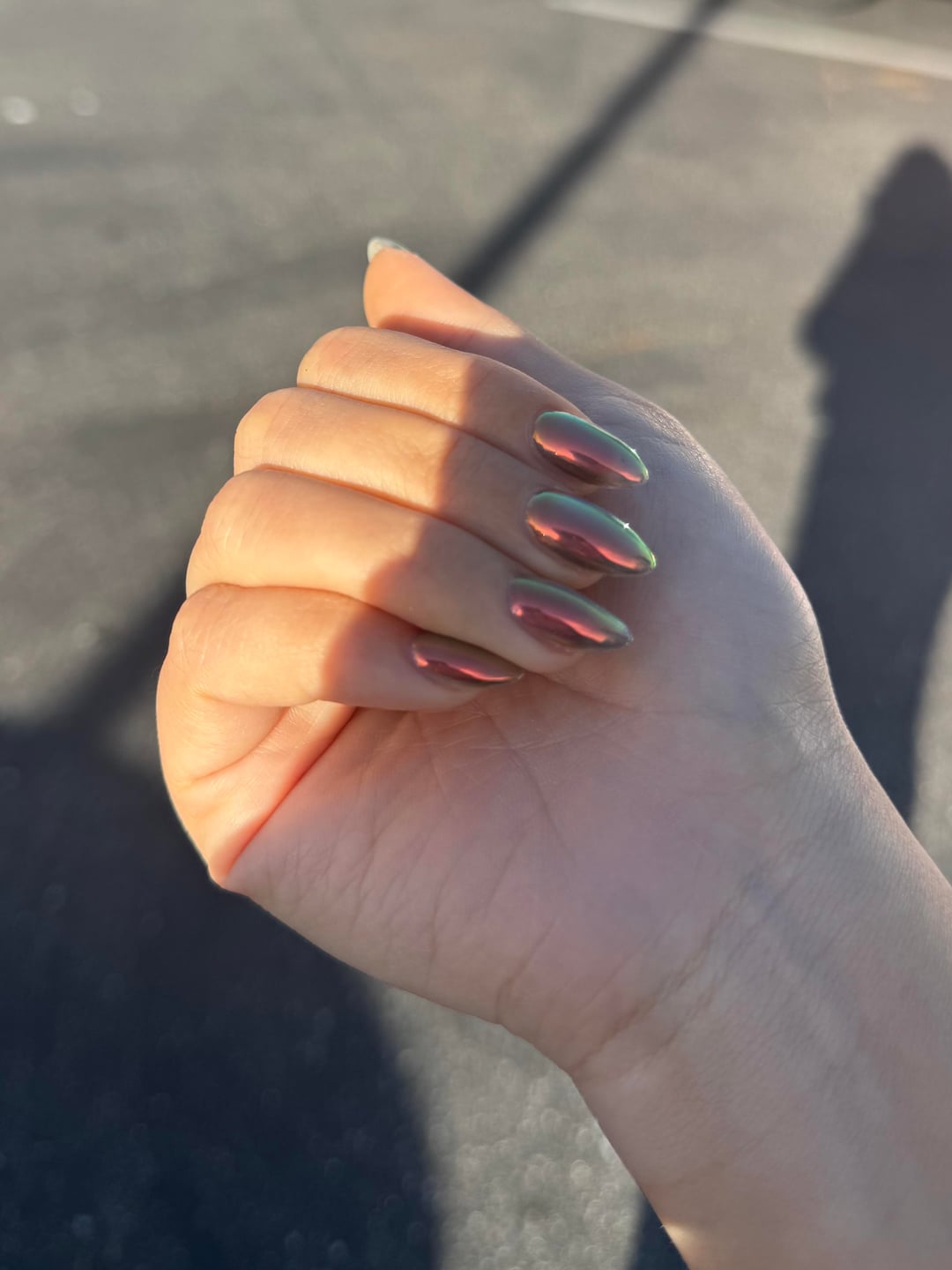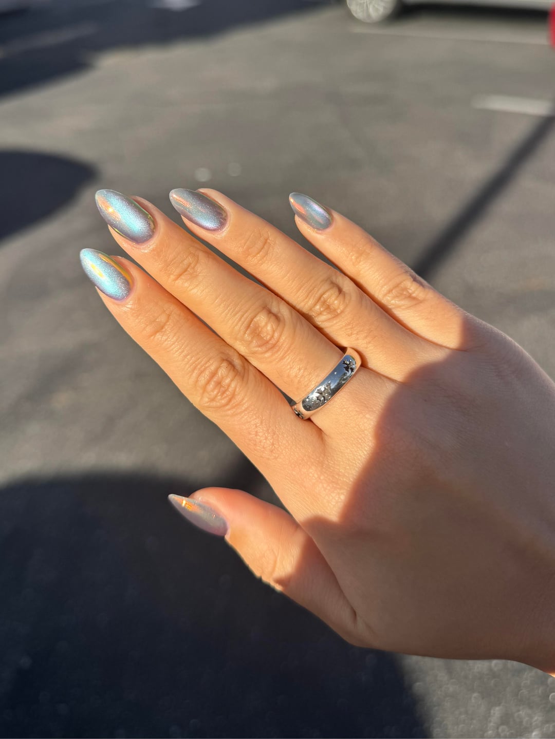 builder gel on my natural nails + cateye + chrome powder on top! they look different in every angle i'm in love by LegitimateQuit418