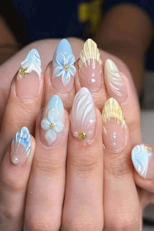 Obsessed with the 3D texture on these. Transitioning into summer with some mermaid-inspired details and soft pastels. Credit: Nails x Mayonita by heavenly_raven_