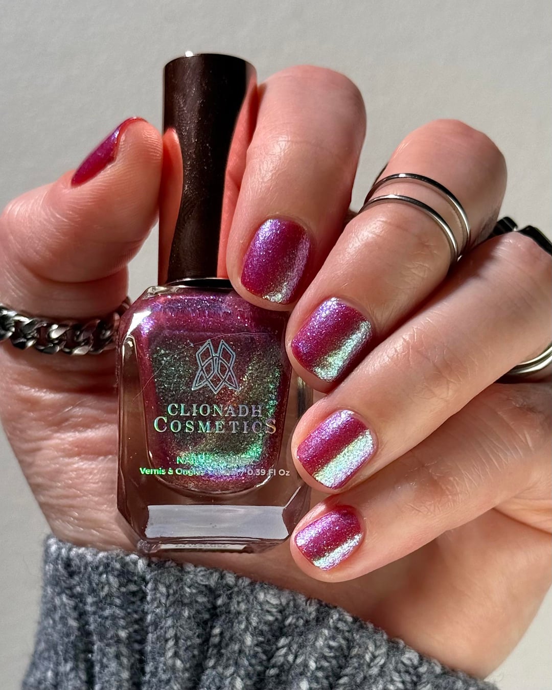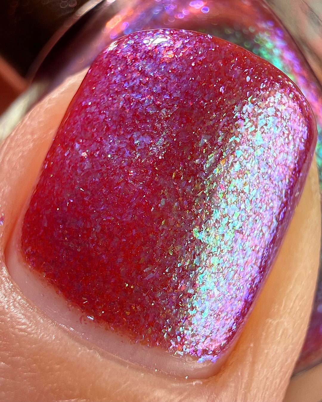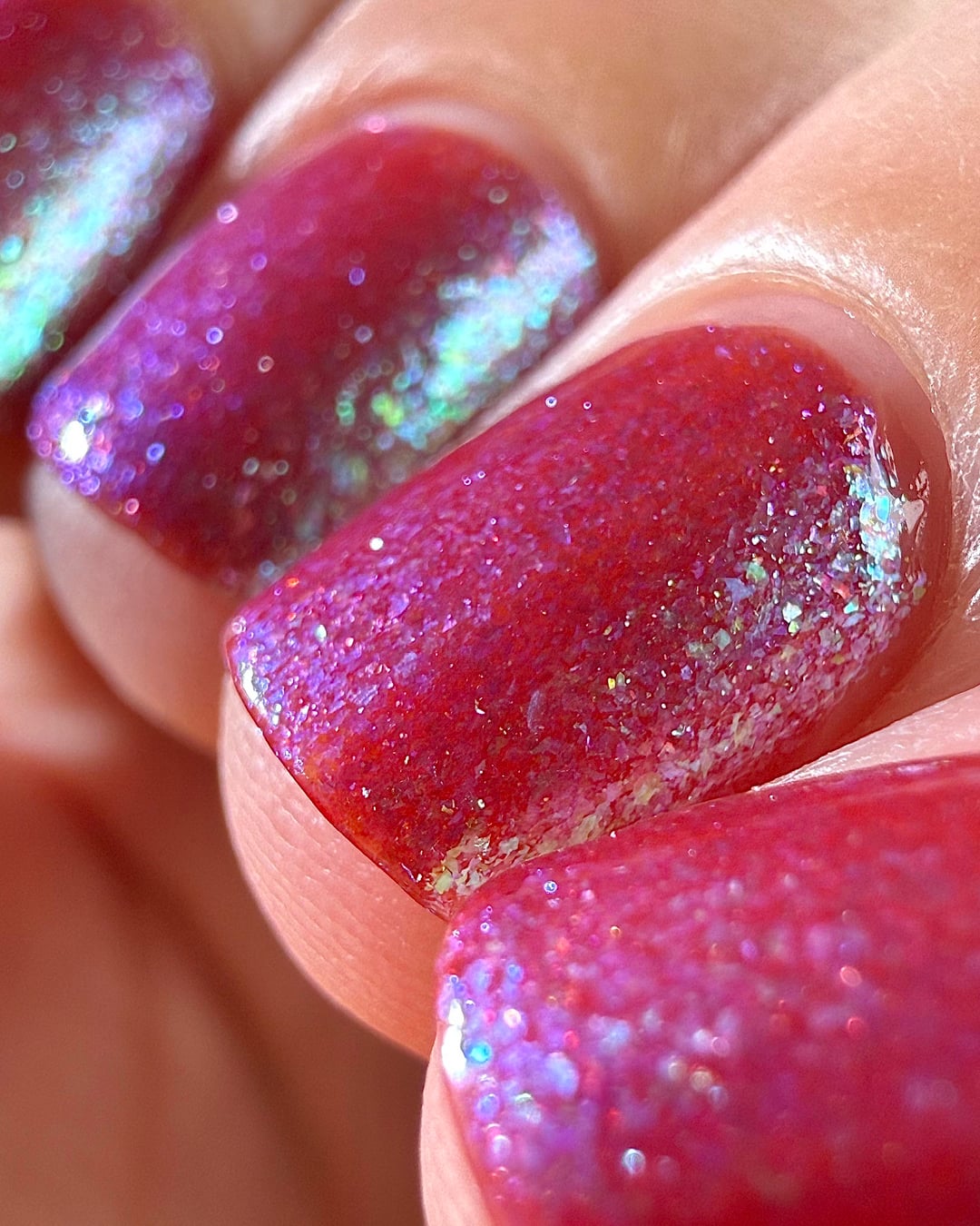 Warm purples with red/gold/pink shimmers (like cock a doodle doom).