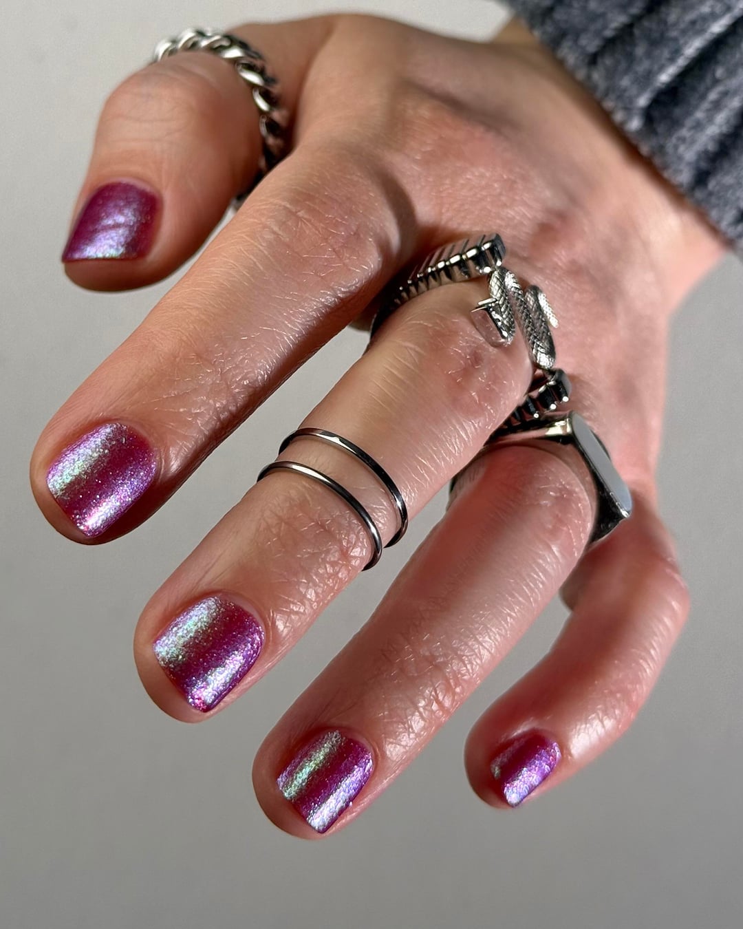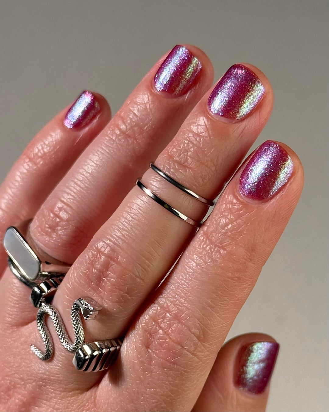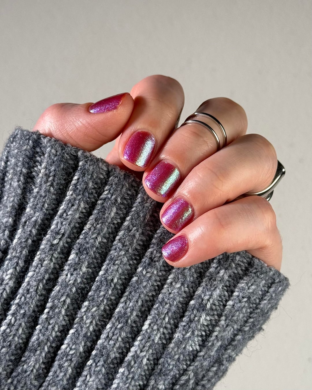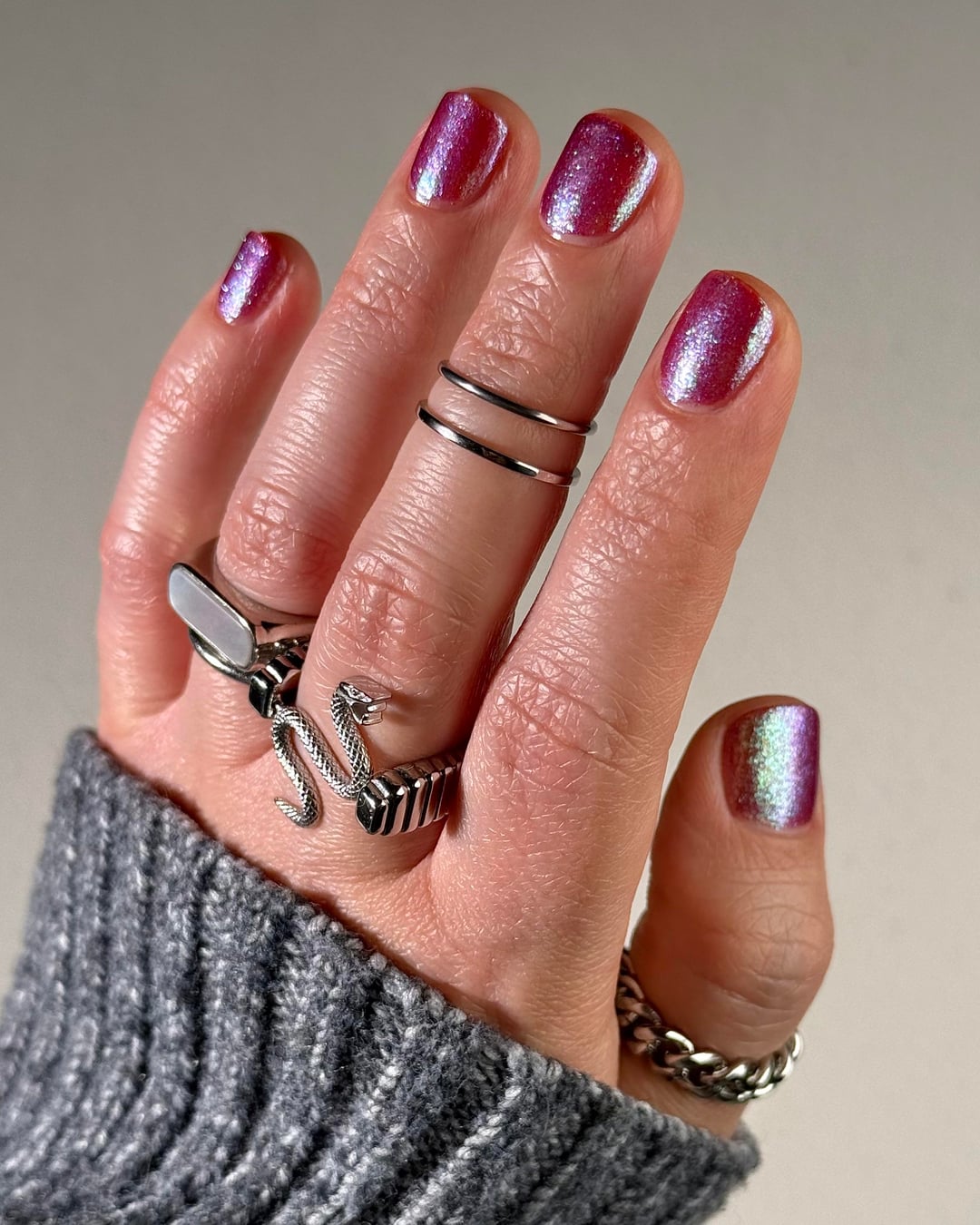 Warm purples with red/gold/pink shimmers (like cock a doodle doom).
